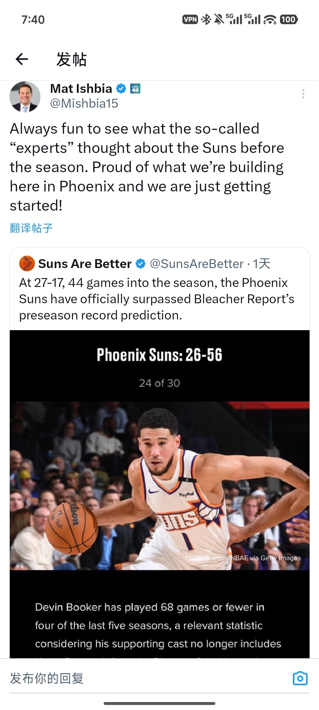 有个太阳自媒体推主说:本赛季已经进行了44场比赛,太阳27胜17负,正式超过B/R在开赛初对太阳胜场的预测。随后老板伊什比亚转发说:看看开赛前,那些所谓的“专家”们对太阳队的预测真的很有趣。我们为正在致力于打造的一起而自豪,而且这还只是个开始!菲尼克斯太阳太阳vs老鹰
