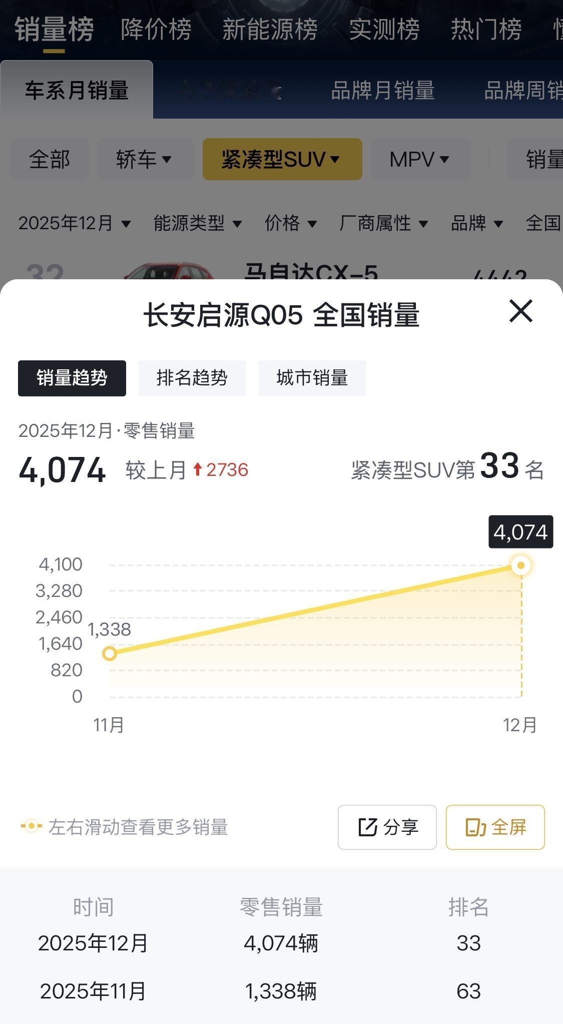 启源Q05,上市两个月,销量成倍上升。 首月1338辆,第二月销量4074辆。在我看来,符合预期,又稍低于预期。符合预期,是其快速增幅,翻两番;低于预期是认为其销量还可以再高一些的。 这款车的最竞争力很强的,有兴趣的可以去查一查。