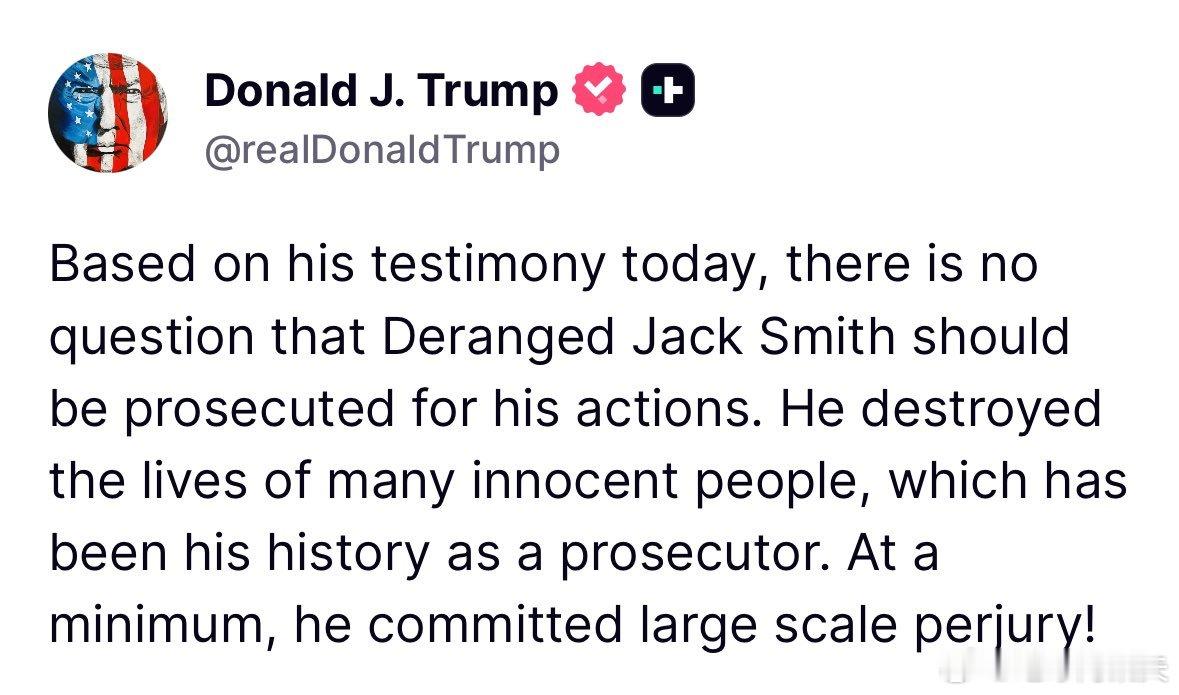 ‼️特朗普最新:“根据他今天的证词,毫无疑问,“疯癫的”杰克·史密斯应该因为他的行为而遭到起诉。他摧毁了许多无辜者的生活,而这正是他作为检察官的历史记录。至少,他犯下了大规模伪证罪!”特朗普索赔50亿热点现场海外新鲜事
