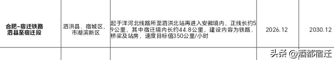 好消息!合宿铁路宿迁段计划于2026年底动工。这条铁路意义重大,其北与京沪高铁辅助通道相连,南接合肥枢纽,还与沪汉蓉、合安九、合福铁路相互贯通。建成后,宿迁东站将融入全国高铁网络。从宿迁启程,经由此铁路,向北可快速抵达山东半岛,向南能够畅达粤港澳大湾区,极大地缩短了宿迁与国内重点城市之间的时空距离。这不仅让居民出行更为便利,还能促进区域经济联系,加强资源开发,助力宿迁打造长三角北翼区域性综合交通枢纽。