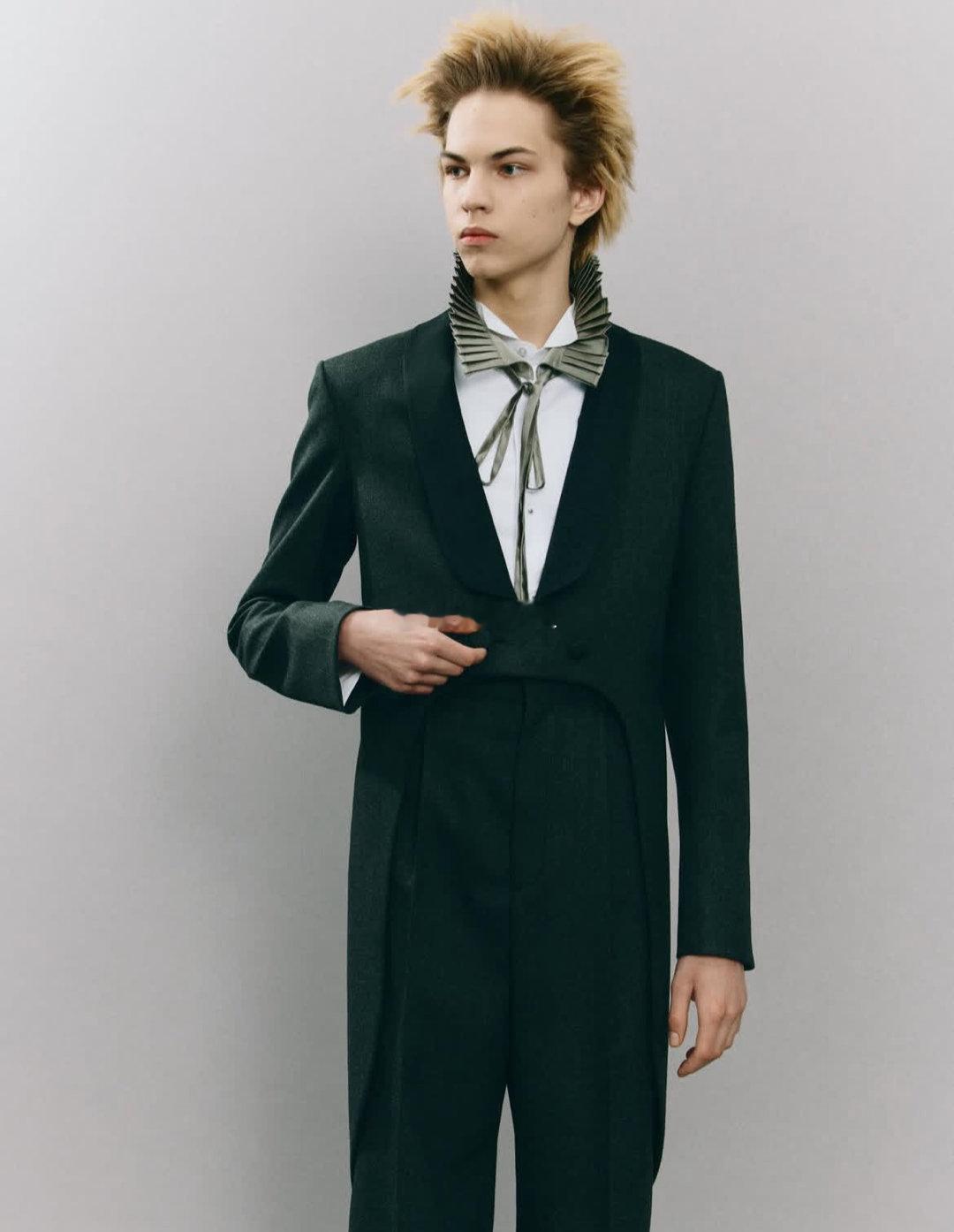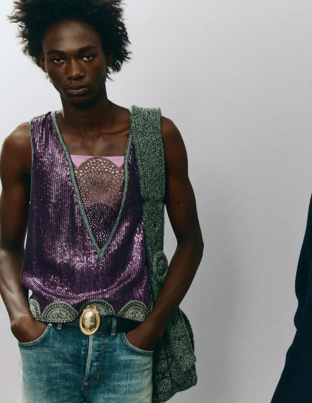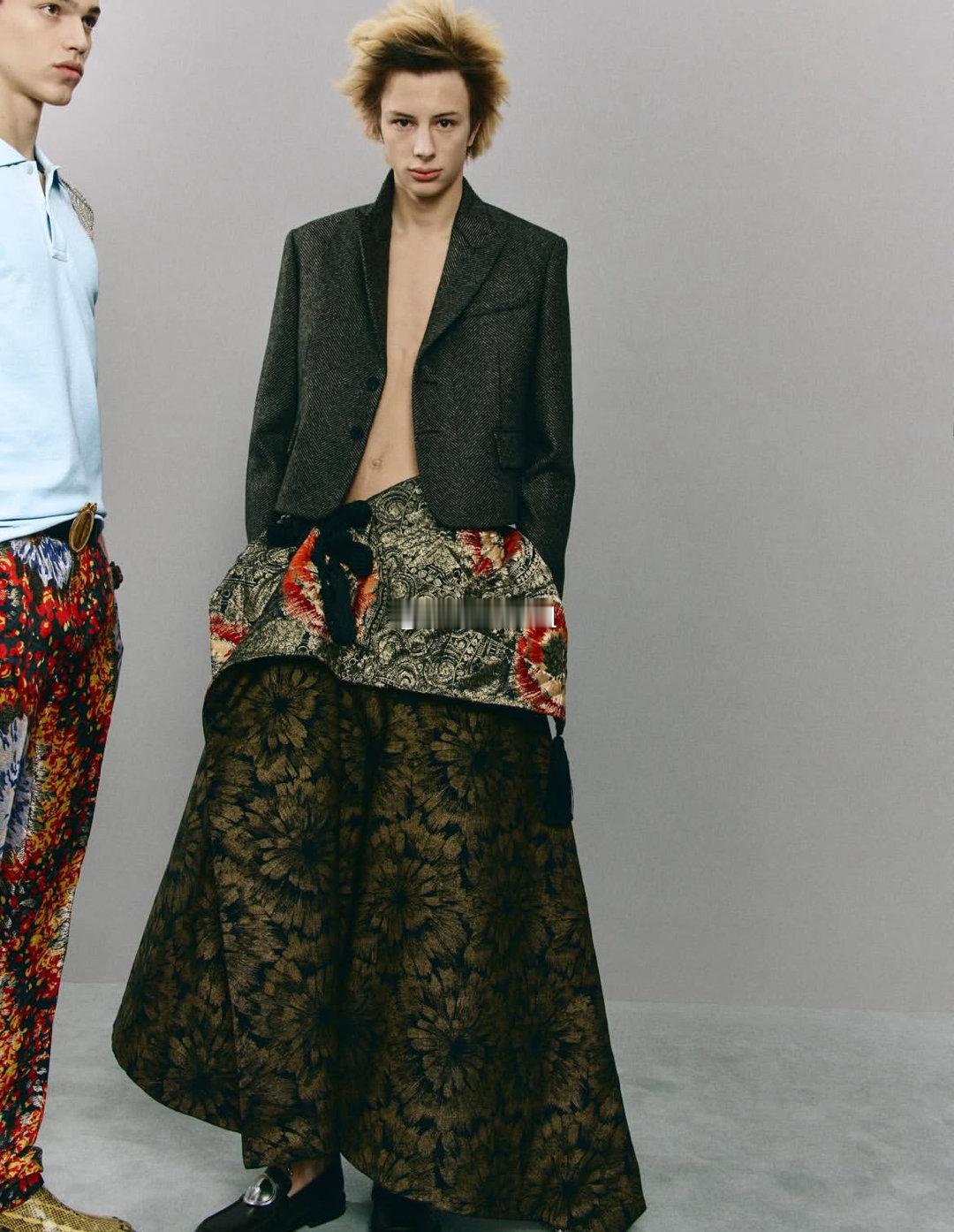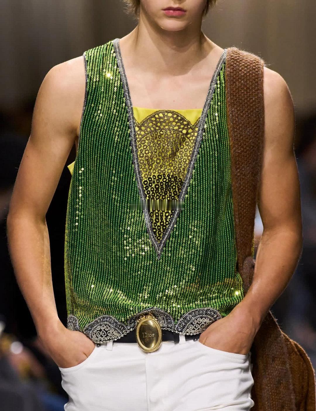 迪奥男装2024秋冬大秀|来自JonathanAnderson的解构狂想,每一套造型都是一个灵魂切片。亮片透视背心 × 粗砺牛仔 × 未来主义墨镜精致与粗野在针脚间拉扯;宫廷锦缎斗篷从 trench 风衣中破茧历史褶皱撞上都市剪影;巨型睡袋外套裹住身体曲线安全感与流浪感达成微妙共生。破碎蕾丝绽放在工装夹克肩头,当绅士准则崩解成镜像碎片,现代男性气质的千百种可能在此野蛮生长。这场华丽而矛盾的自我博弈,你读到了几分?DIOR大秀巴黎男装周男装周