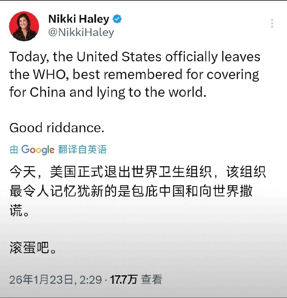 美国前驻联合国大使妮基•黑利,北京时间1月23日发文:“今天美国正式退出世界卫生组织。该组织最令人记忆犹新的是包庇中国,向世界撒谎,滚蛋吧!” 个人认为:这位美国人这么恶意抹黑中国,颠倒是非,扭曲事实,指鹿为马,任意诋毁,是为了什么? 个人预判,是为了赚钱。这样不容易被美国斩杀线所屠杀。另外一个原因是为了存在感,刷刷脸,容易生存。