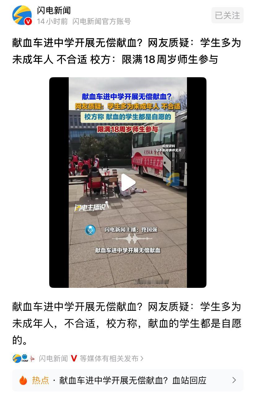 献血车开进中学校园开展无偿献血? 校方回应:仅限满18周岁师生参与! 大多数网友