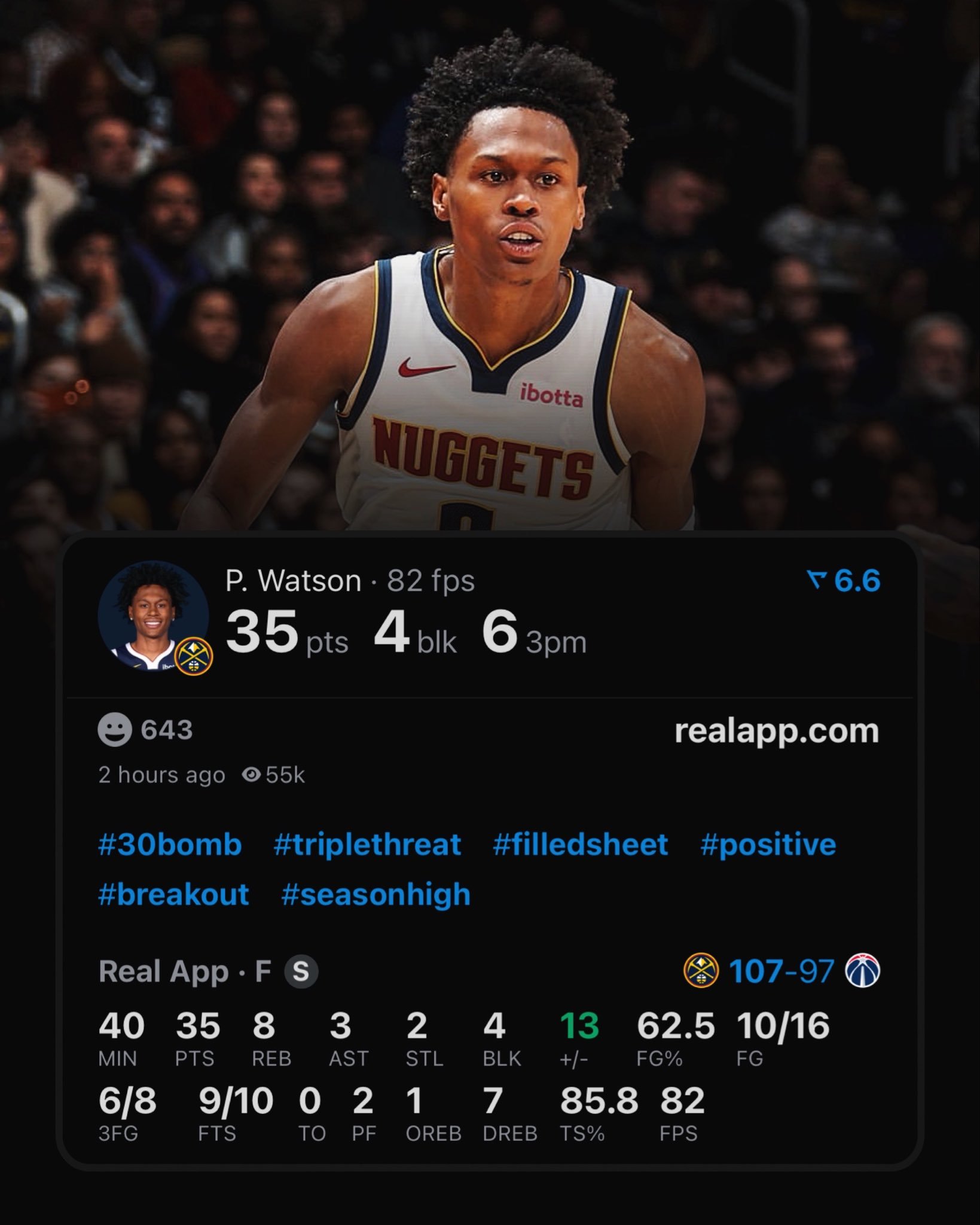 沃特森生涯之夜35分(生涯新高)8篮板3助攻4盖帽2抢断0失误三分8中6(平生涯最高)掘金vs奇才NBA