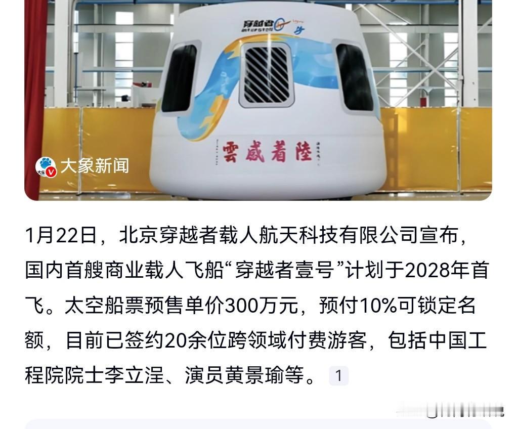 我的天呐,中国也将有自己的飞船进行太空旅游了。 各位先别急,一般人是出不了的,因为门票就要300万一张。 300万对老百姓来讲很多,但是仍然挡不住那些购买力强的人想去。 其中就包括著名演员黄景瑜。 已经预定了,预计2028年飞往太空。 人这一辈子,有的人就是想体验大多数人体验不到的那种乐趣啊。 毕竟上太空的机会,那不是人人都能有的。 这么一想的话,对有钱人来说,那300万肯定是物有所值的。