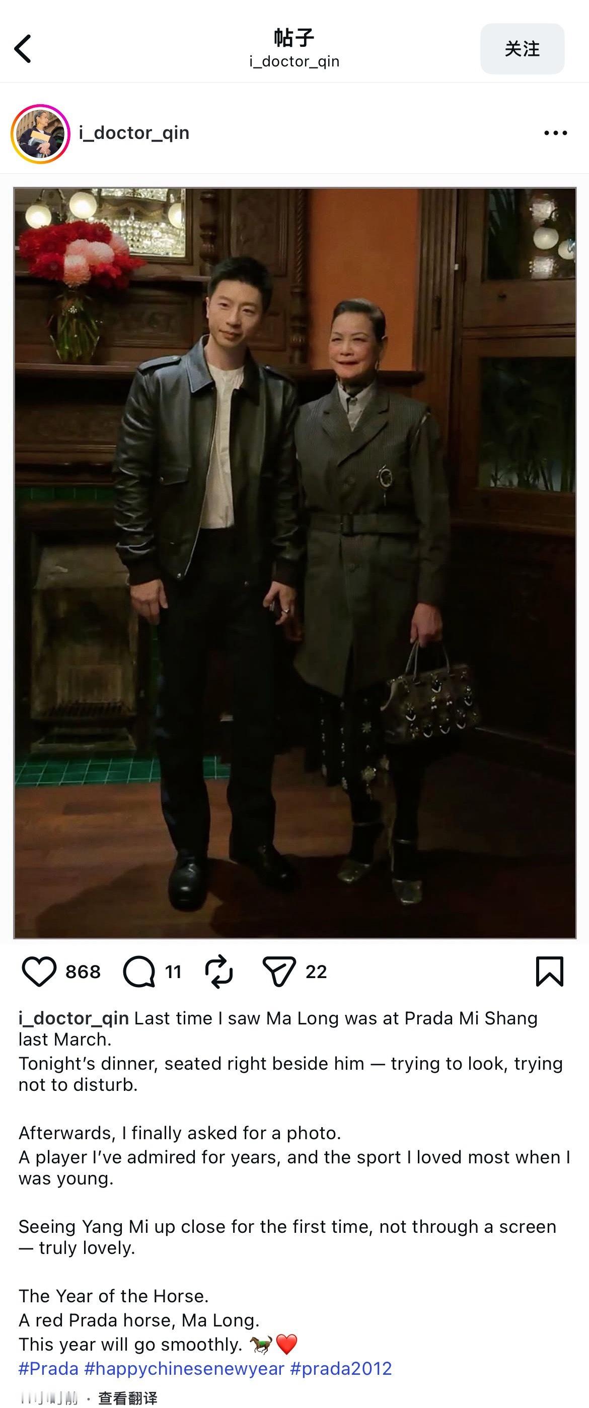 70岁登上时装周的覃惠兰医生ins更新“我上次见到马龙是在去年3月的普拉达迷上荣宅活动现场。今晚的晚餐,我坐在他身旁——尽量只是看着不打扰。之后,我终于要了一张合影。一位我多年来一直钦佩的球员,也是我年少时最喜爱的运动项目。首次近距离观察杨幂本人,而非通过屏幕—真可爱。马年。红色的Prada小马,马龙。今年会顺顺利利。”