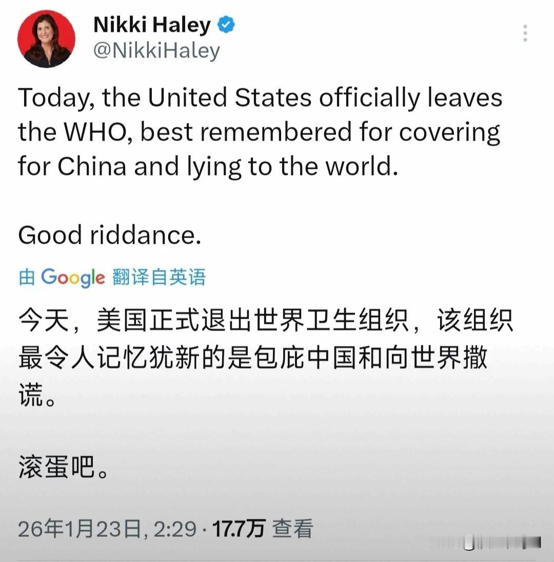 美前大使甩锅中国 为美退出世卫叫板 美正式退出世卫组织,前驻联合国大使妮基·黑利发文抹黑中国。 北京时间1月23日,妮基·黑利发布文字内容,直指世卫组织包庇中国且向世界撒谎,还附带滚蛋吧的表态,将美国退群的行为完全甩锅给世卫组织和中国,言辞尽显刻意针对。 世卫组织始终以科学公正为行事准则,全程推动全球抗疫工作。中国在疫情期间率先公开疫情相关数据,分享成熟防控经验,所有行动均被国际社会看在眼里,实打实的付出从未有过半点掺假。 黑利的言论满是无知与恶意,纯粹是为美国的单边主义行径找补,把黑白彻底颠倒,肆意诋毁他国的做法,就是典型的耍无赖。其言论如同遮羞布,妄图掩盖美国部分政客推卸责任转嫁矛盾的真实想法,冷战思维与政治偏见在话语里暴露得一干二净。 这类毫无底线的抹黑行为,只会让美国的国际形象持续下跌,也会让美国在国际社会愈发孤立,最终被国际社会共同排斥。 你怎么看黑利此番无脑甩锅的行为。评论区来聊聊。