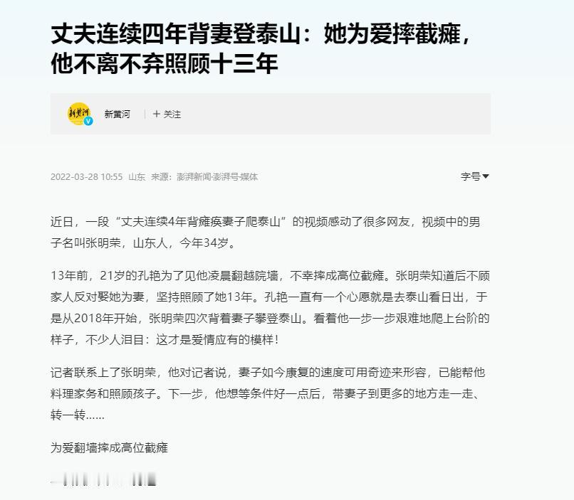 2008年,山东21岁女子为爱翻墙私奔摔成瘫痪。男友知道后,不惜与父母断绝关系,也要娶她为妻。谁料到10年后,丈夫背起妻子,经历12小时,一步一步登上泰山之巅看日出。 在那12个小时里,张明荣背负的不仅仅是一个人,更是两人这十年来沉甸甸的命运。这漫长的登山路,恰如他们过去十年走过的人生路,充满了坎坷、冷眼与挣扎,却唯独没有放弃。 2008年,21岁的孔艳爱上了家境贫寒的张明荣。但这段感情遭到了孔家父母的强烈反对,为了阻断两人的来往,孔艳被锁在了家里。 年轻气盛的姑娘为了追寻爱情,在夜色的掩护下做出了一个改变终生的决定——翻墙私奔。 但谁也没想到,孔艳翻墙的时候发生了意外,脊椎受到重创,医院诊断为高位截瘫。 这意味着孔艳的下半生只能在床上度过,吃喝拉撒都需要人照顾。面对这样一个突如其来的噩耗,原本极力反对婚事的孔家父母心态彻底崩了。 在他们看来,女儿是为了那个男人才落得如此下场,这个烂摊子理应由男方承担。在结清了住院费用后,孔家二老选择了离开,将瘫痪在床的女儿留给了那个一无所有的穷小子。 当时的张明荣面临着巨大的抉择。 张明荣自己的父母放出了狠话,家里日子本就不好过,如果非要带个瘫痪的女人回来,那就断绝父子关系。 一边是至亲的最后通牒,一边是孤立无援的爱人,张明荣没有过多的犹豫,他在大年初七那天,收拾了几件衣服就奔赴临沂,义无反顾地接下了这个被所有人抛弃的“包袱”。 但生活的艰辛远比想象中来得猛烈。 为了给孔艳治病,张明荣很快就花光了积蓄,还背了一身债。在这个陌生的城市里,他成了唯一的顶梁柱。 为了活下去,他什么苦活累活都干。白天,他去物流市场当装卸工,那种高强度的体力活,卸满整整一车货也只能拿到二十块钱的微薄报酬。 晚上收工后,他顾不上休息,还得火急火燎地赶回家,给妻子翻身、擦洗、换尿布,处理那些因为长期卧床而生的褥疮。 夜幕降临后,为了多挣几块钱,他又推着小车去夜市摆摊。从炒面到卖衣服,只要能赚到钱的营生,他都尝试过。无数个夜晚,张明荣累得直不起腰,但他从没在妻子面前喊过一声苦。 看着丈夫日渐消瘦的背影,孔艳内心充满了愧疚,她无数次流着泪想把丈夫推走,不想让自己成为他的累赘。但张明荣的心像铁打的一样,他认定了这份责任,就没想过回头。 这一熬就是好几年。虽然两人在2015年领了结婚证,成为了合法夫妻,但因为经济拮据,也为了躲避周围人的闲言碎语,他们甚至没有举办一场像样的婚礼。 生活虽然清贫,但张明荣心里一直记着一件事。 那是孔艳还没出事的时候,曾随口提过想去泰山看日出。当时张明荣答应得很痛快,没想到这个承诺,一等就是十年。 2017年,张明荣决定兑现诺言。他没有选择轻松的索道,因为他知道妻子想要的是那种“亲自”攀登的感觉。 于是他用床单把孔艳绑在背上,从山脚开始,一步一个脚印地向上攀登。 到了最为险峻的十八盘,山路陡峭,张明荣几乎是手脚并用,靠着顽强的意志力在挪动。周围的游客看着这一幕,无不为之动容,但没人知道这背后的艰辛。 当第二天清晨的第一缕阳光洒在泰山极顶,映照在孔艳的脸上时,她笑得像个孩子。张明荣看着妻子的笑脸,积压在心底十年的情绪在那一刻爆发,泪水夺眶而出。 这不仅是一次登山,更是他们对命运的一次宣战——即便生活将我们打入谷底,我们依然有能力站在最高处看风景。 2020年生活逐渐安稳下来的张明荣,终于为妻子补办了一场迟到了十二年的婚礼。那一刻,孔艳身披洁白的婚纱,一双儿女环绕膝下,所有的苦难都化作了这一刻的幸福泪水。 从私奔摔瘫被抛弃,到背妻登山感动世人,张明荣用十二年的青春,诠释了什么是男人真正的责任与担当。在这个快节奏的时代,这种生死相依的感情显得尤为珍贵。 如果你的伴侣遭遇了同样的变故,你是否有勇气像张明荣一样,背起爱人走完这漫长而艰难的一生?欢迎到评论区讨论 信息来源:澎湃新闻