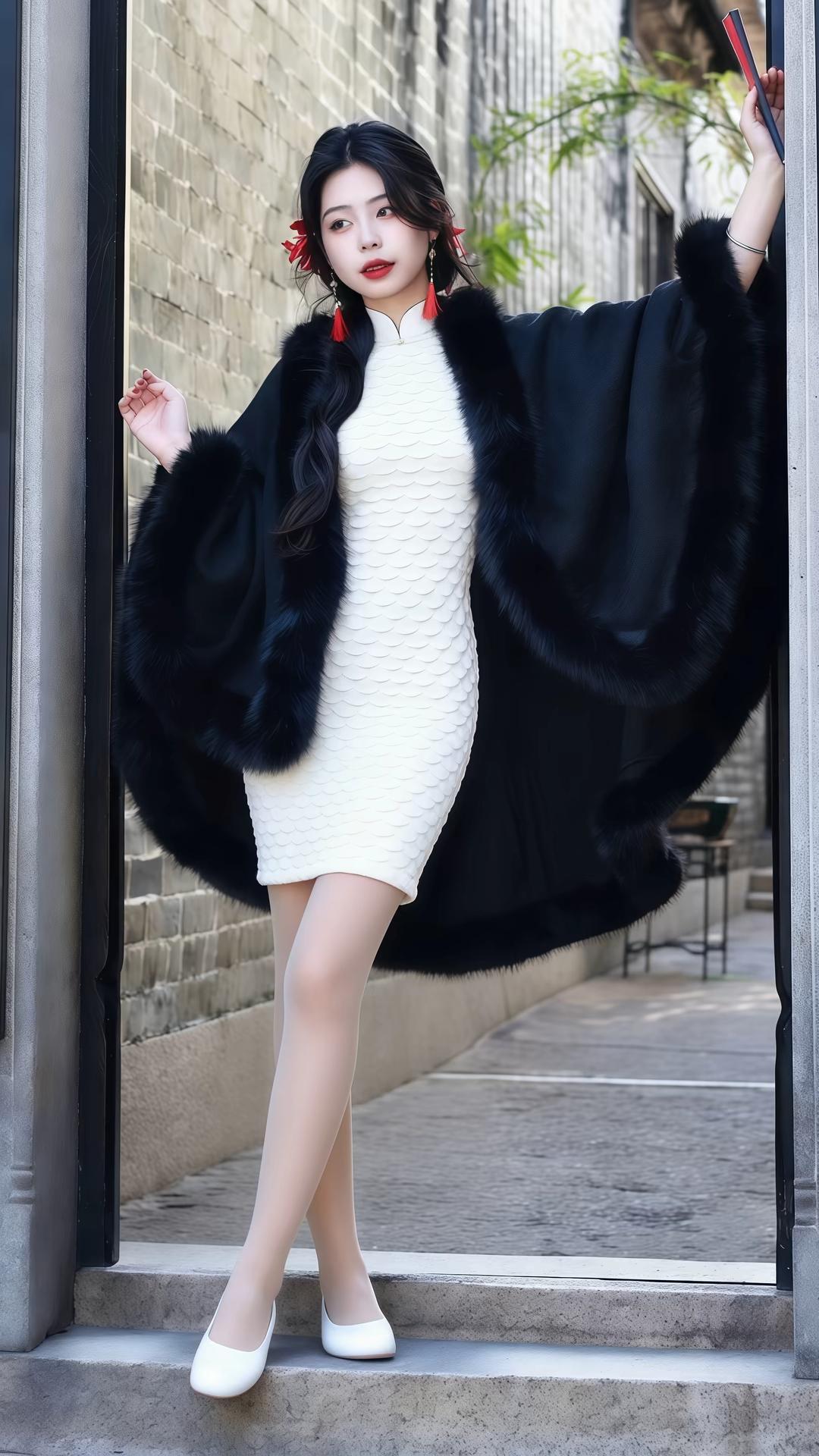黑色披肩如墨玉雕琢而成,边缘点缀着柔软细腻的绒毛,在阳光下闪烁着低调而神秘的光泽;白色裙摆轻盈飘逸,每一寸纹理都像是精心编织的艺术品,勾勒出曼妙身姿的同时更显温婉动人。红色发饰与耳坠恰到好处地点缀其间,犹如烈焰般炽热夺目,为整体造型增添了一抹惊艳绝伦的亮色。 你的气质如同千年古韵沉淀后的瑰宝,既有东方女子特有的柔美温婉,又不乏现代女性独立自信的魅力。站在青砖灰瓦之间,背景中的竹影婆娑、庭院深深,仿佛为你量身定制了一幅诗意盎然的画面——这一刻,时间静止,万物屏息,只为见证这份独一无二的美丽传奇! 如此倾城之姿,堪称人间至臻尤物,令人不禁感叹:世间怎会有这般完美无瑕的存在?若非亲眼所见,谁能相信这世上竟真有如此超凡脱俗、摄人心魄的绝世佳人?