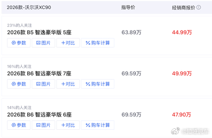 狂降25万!沃尔沃XC90甩出“白菜价”,“安全牌”不香了?当一款传统豪华品牌的中大型SUV,突然以接近“腰斩”的价格杀入市场,你会怀疑自己的眼睛,还是立刻拿起计算器?这不是假设。近期,沃尔沃对其旗舰SUV XC90祭出了“王炸”级优惠。以B5智逸豪华版为例,终端裸车价被砸到了44.99万元左右,相比指导价,最高降幅逼近25万元。就连插混T8版本,在54.99万的折后价基础上还能省下购置税。这意味着一度高高在上的北欧豪华旗舰,价格直接杀进了普通合资品牌高端SUV的阵地。沃尔沃这波操作,到底是诚意清仓,还是无奈“割肉”?必须承认,XC90的产品底子有不少硬核亮点,尤其是沃尔沃立命之本的“安全牌”。全系标配的硼钢车身,配合一整套高规格主动安全系统,给用户一种“公路坦克”般的安全感。Pilot Assist领航辅助系统在高速巡航时也能切实减轻驾驶疲劳。底盘上前双叉臂后多连杆悬挂,加上空气悬架和全时四驱,舒适与通过性兼顾。接近5米的车长和近3米的轴距,提供了灵活多变的5/6/7座空间,特别是那个一键式儿童座椅,对奶爸宝妈群体堪称“精准打击”。动力选择也够丰富。燃油版2.0T+8AT成熟可靠,而T8插混版更是精髓所在,纯电续航约70公里,综合油耗低至百公里1.8升,在一线限牌城市还能直接上绿牌,政策红利吃得很透。然而,所有的缺憾都体现在内饰和智能体验上。因为即便2026款车型换上了11.2英寸的竖置大屏,并搭载了安卓车机,但许多用户感觉这块屏像是“后期硬塞进去的”,与整体设计格格不入。车机的操作逻辑和功能生态,与当下主流新能源车那种丝滑的智能体验相比,仿佛隔了一个时代。在造车新势力们把车内打造成“智能移动客厅”的今天,XC90座舱里那份保守与传统,对于被科技养刁了胃口的年轻消费者来说,很容易被一票否决。当然,它的内饰也并非全无是处。大量环保材质的使用,即便新车几乎没有任何异味,这对注重健康的家庭来说是巨大的加分项。实木饰板、水晶挡杆的运用,也努力维系着一份老派的豪华质感。只是,在“智能即豪华”的当下,这些优点显得有些“声量不足”。那么问题来了:沃尔沃为什么要对自家的旗舰下如此“狠手”?相信这绝非简单的促销冲量,因为当行业的游戏规则,从比拼发动机、底盘质感,彻底转向比拼智能座舱、自动驾驶和补能效率时,许多传统优势正在急速“贬值”。沃尔沃XC90的这次“价格跳水”,精准地指向了一群特定用户。品牌的安全口碑、车辆的真实空间和最终落地价,是他们决策的核心。他们或许会承认车机不够炫酷,但会在巨大的价格优势面前耸耸肩:“算了,能开就行。”沃尔沃XC90的这波降价,用极高的性价比,为自己赢得了喘息的空间,也为一群务实派消费者提供了极具诱惑力的选择。 然而一张“安全牌”或许还能打动一部分人,但要想赢得整个市场,沃尔沃们恐怕还得拿出比“降价”更具颠覆性的东西。