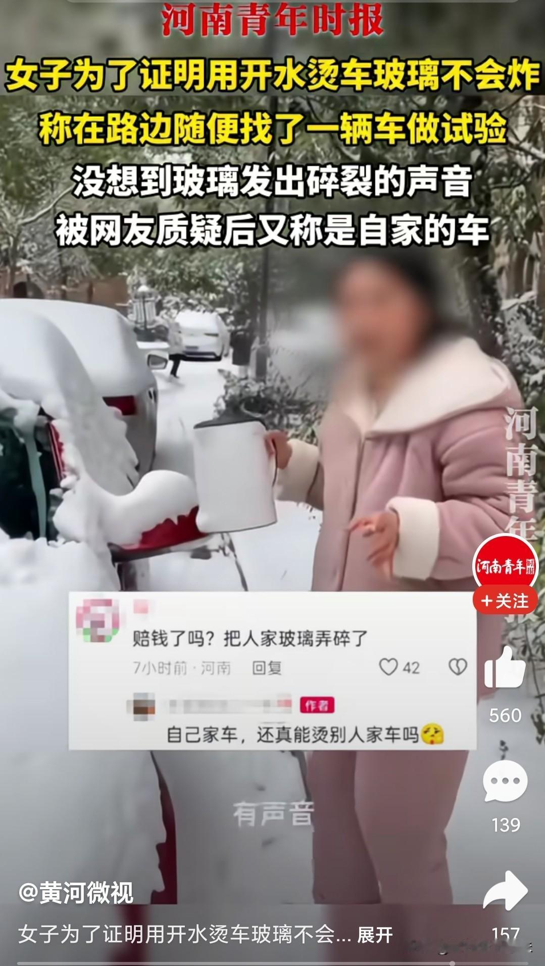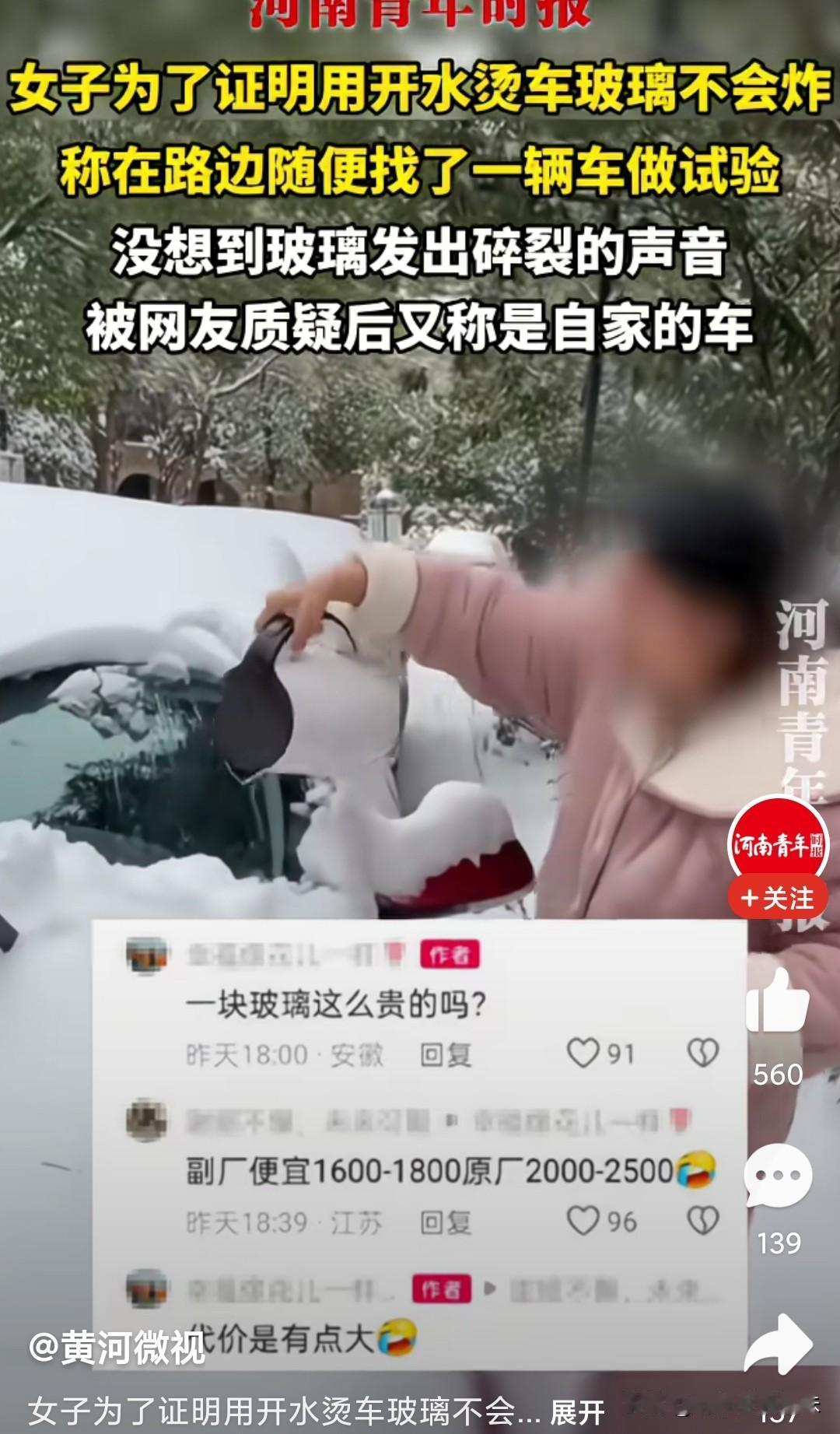人得愚蠢到什么程度? 女子在下雪天后发视频称,用开水浇车玻璃会碎掉这种说法属于无稽之谈,非得自己亲自做实验验证,结果直接被打脸了。 据青年时报报道,女子为了证明用开水烫车玻璃不会炸,提着刚刚烧开水的水壶,称在路边随便找了辆车做实验。 视频里女子走到路边停着的电车,电车上被厚厚的雪覆盖着,只见女子提起水壶把水倒了上去,嘴里还说着雪有点厚实。 随着第二下倒进去时候,只见一声清脆的破裂声传出来,明显车玻璃已被开水烫碎了。 有网友评论,等着赔偿人家车玻璃吧,原厂玻璃2000-2500,哪怕换副厂的也得要1600-1800,女子随即回复是自家的车,并不是原先随便在路边找的车。 不论是自家车还是路边随便找的,这回测试代价确实有点大。 冬季车玻璃存有积雪,用开水烫车玻璃的方式除雪是最不对的行为,由于温度过低,车玻璃遇高温会快速热胀,低温区域又冷缩,内外应力骤增就会直接开裂。 所以,女子采用开水烫车玻璃除雪是不对的。冬季除车窗冰/雾有更安全的替代方法,比用水更稳妥: 1. 启动车辆开暖风,调至前挡风除雾模式,配合雨刮慢慢融冰。 2. 用专用除冰剂、除冰铲轻轻清理,避免刮伤玻璃。 3. 提前给车窗贴防霜膜,或停车时盖上车窗防霜罩,从源头减少结冰。 大家冬季平时都用什么方式除去玻璃上的积雪的,评论区聊聊看