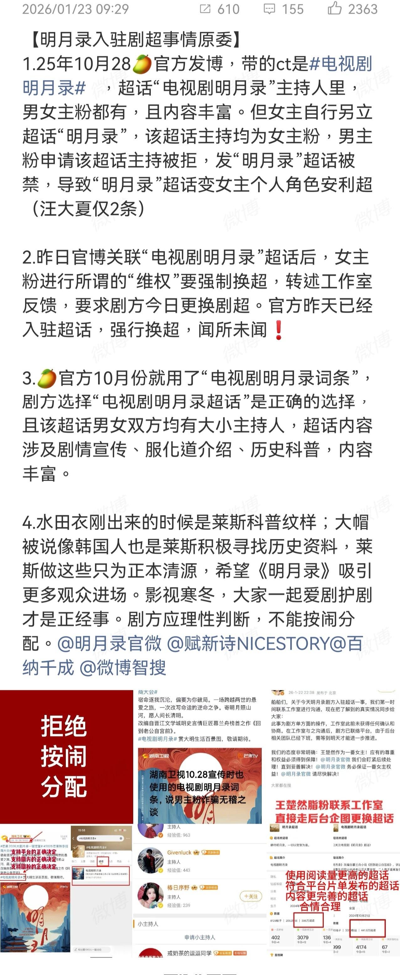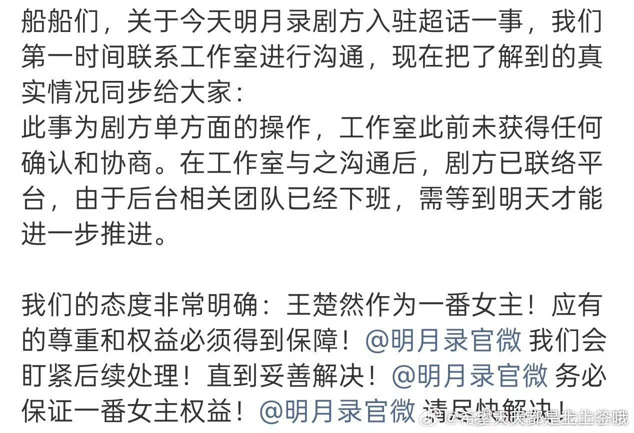 明月录,王楚然,辛云来①王楚然粉控诉剧组不经过商量,单方面入驻由辛云来粉丝主导的剧超话,要求保障“一番女主”权益。②辛云来粉反诉,该超话男女主管理平分,而另一个超话仅有女主粉,个人安利超,男主粉申请都被拒