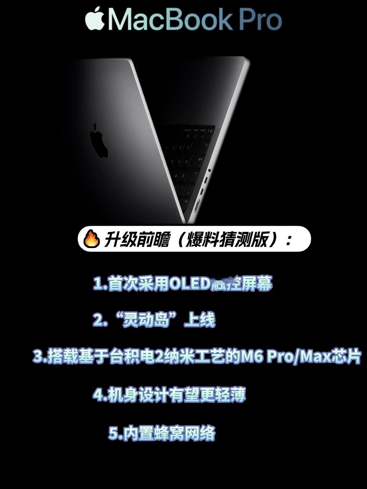 这几天多方消息透露称,苹果可能在2026年底或2027年推出全新设计的MacBook Pro,看点一个比一个足: OLED触控屏:首次采用OLED屏幕,色彩和对比度飞跃,更关键的是或将首次支持触控操作! “灵动岛”上线:屏幕顶部的“刘海”可能消失,改为iPhone上那种可交互的“灵动岛”,边框更窄。 2nm“猛兽”芯片:搭载基于台积电2纳米工艺的M6 Pro/Max芯片,性能和能效预计有显著提升。 机身更轻薄:得益于新屏幕等,机身设计有望更轻薄,但好消息是实用端口可能得以保留。 内置蜂窝网络:苹果可能为Mac加入内置5G/LTE功能,电脑直接联网,不再依赖手机热点。 苹果[话题]  MacBookPro[话题]  数码资讯[话题]  OLED屏幕[话题]  苹果新品爆料[话题]  笔记本电脑[话题]