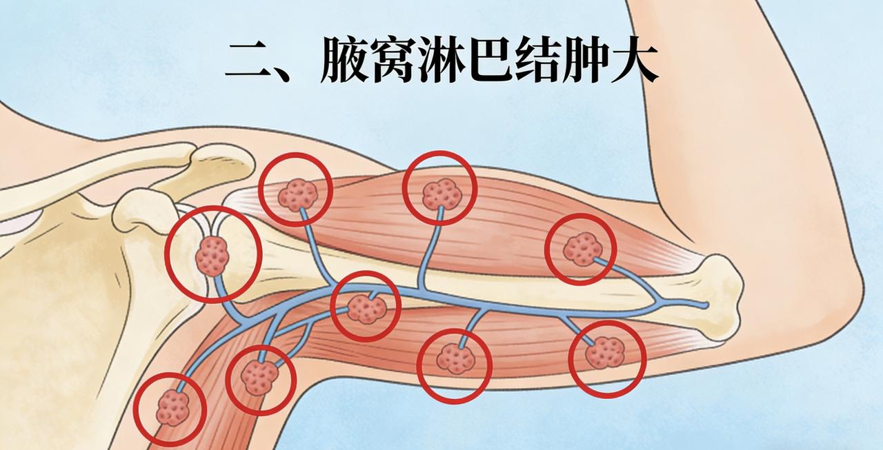 【健康警报:身上这三处淋巴肿大,别不当回事!】 淋巴系统是身体的“安保网络”,一旦这三处淋巴结异常肿大,可能是身体发出的求救信号: 一、颈部淋巴结肿大 如果锁骨上方、耳后或下巴下方出现硬块,且持续增大、不痛不痒,要特别警惕。尤其是左侧锁骨上淋巴结肿大,可能与腹腔肿瘤转移有关。 二、腋窝淋巴结肿大 排除乳腺增生或炎症后,若腋窝出现质地坚硬、活动度差的肿块,需排查乳腺及胸部相关疾病。 三、腹股沟淋巴结肿大 长期不消退的腹股沟肿块,可能是下肢炎症、生殖系统疾病或全身性疾病的局部表现。 ✅ 正常淋巴结特征: • 大小如黄豆 • 质地柔软 • 按压可滑动 • 按压有痛感(炎症所致) ⚠️ 危险信号: • 直径超过1.5cm • 持续增长超过2周 • 质地坚硬如石 • 固定不滑动 • 无痛感 • 伴随发热盗汗、体重下降 💡 自查建议: 每月一次轻柔触摸检查,重点关注上述区域。发现异常应及时就诊【普外科】或【血液科】,必要时进行超声检查+病理活检。 记住:淋巴结是身体的“烽火台”,它的报警值得我们认真对待,但也不必过度恐慌——及时检查,早发现早干预才是关键。 健康科普 淋巴健康 疾病预防