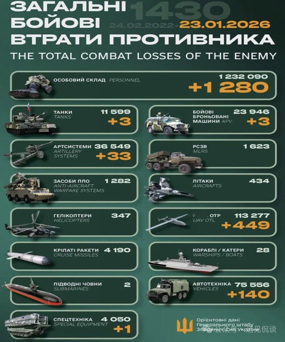 【2026 年1月 23日乌克兰战报 】乌方每天发布而且有累计数,具有连贯性,至少可以看合订本。也欢迎大家转发俄罗斯官方发布带有累计数的每日战报。 俄乌战争爆发第1430天。据乌军总参谋部消息,昨天,俄军伤亡1280人,累计伤亡1232090人。烽火问鼎计划俄罗斯侵略乌克兰战争