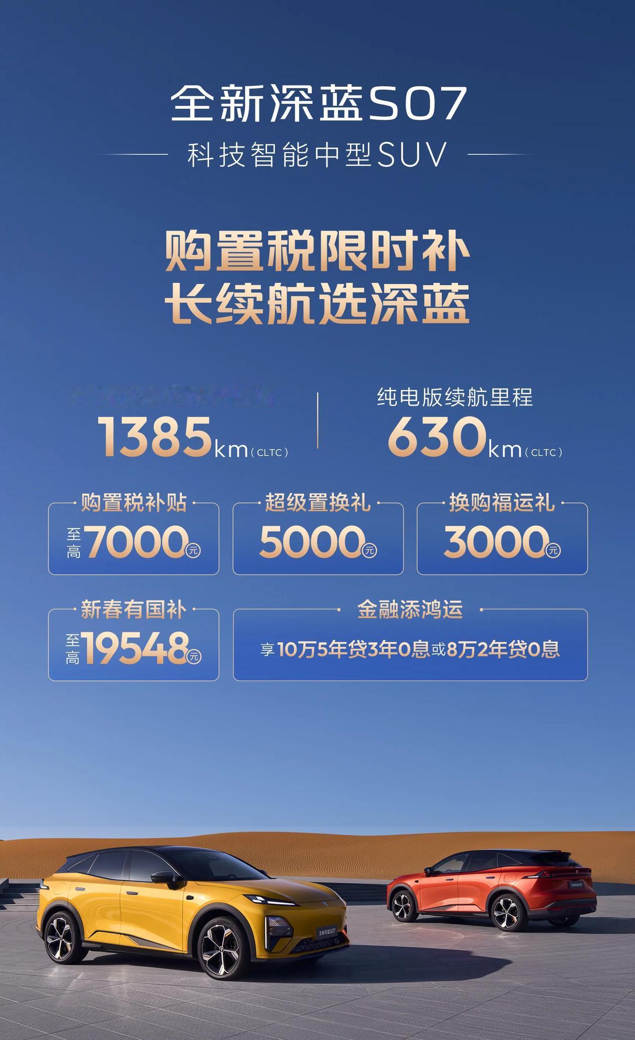 在进入2026年之后,大家购买新能源汽车比较关注的问题,那肯定包括购置税,而就在最近深蓝公布了一系列新春政策,同时也给到了很大的优惠。 不仅给到了至高7000元的购置税补贴,同时还有至高19548元的国补红包等等,当你购买全新深蓝S07时综合优惠算下来挺可观,甚至仅仅12万多就能到手。并且深蓝S07全系标配的华为乾崑ADS SE系统,高速上能智能领航变道,城区塞车时智能跟车避堵,这样的智能体验过年回老家就方便轻松多了。 另外在续航方面全新深蓝S07也是相当的给力,提供了至高630公里纯电续航和1385公里综合续航(增程),满足你的通勤和长途出行需求,更为关键的是年底还能提现车,不用怕定了之后提不到车。