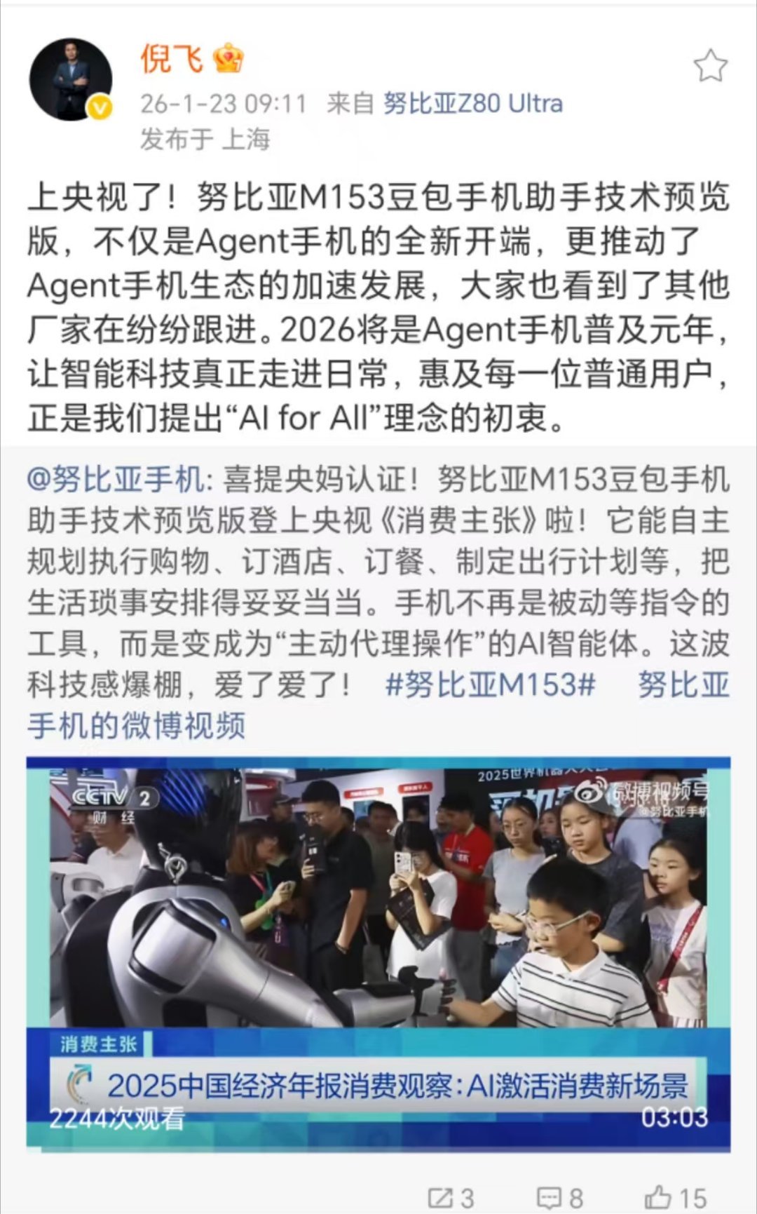 努比亚M153登上了央视《消费主张》,给我的第一感觉不是品牌赢麻了,而是Agent手机这事儿,好像真要来了。反观以前的AI手机,顶多是陪你聊天、帮你P图,真正点外卖、订酒店、做行程,还是得你自己一顿点。现在直接让AI去规划和执行,这才叫帮你办事。倪飞说2026是Agent手机普及元年,我觉得还真不是随口画饼,当手机开始替你操心生活琐事的时候,科技才真的变成了好用,而不是好看。倪飞称2026将是Agent手机元年