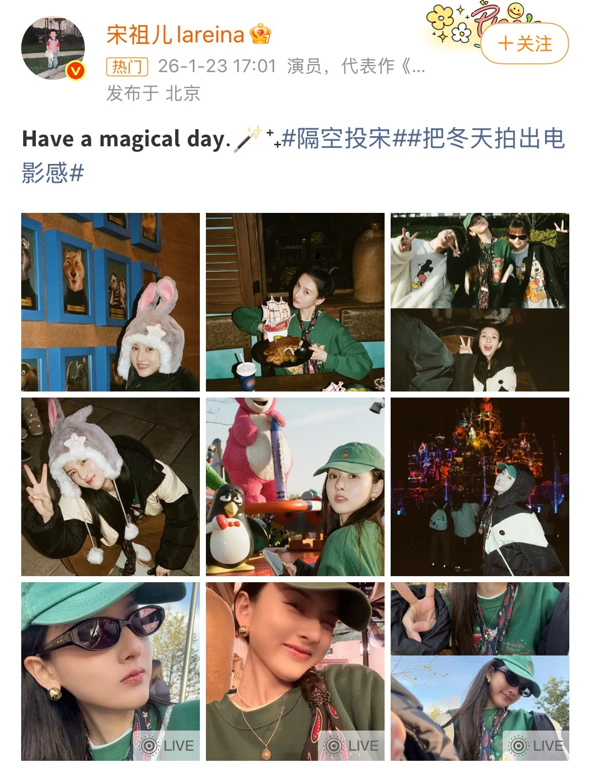 宋祖儿迪士尼出游九宫格宋祖儿发了迪士尼游玩的九宫格~2025微博之夜爆款创作大赛