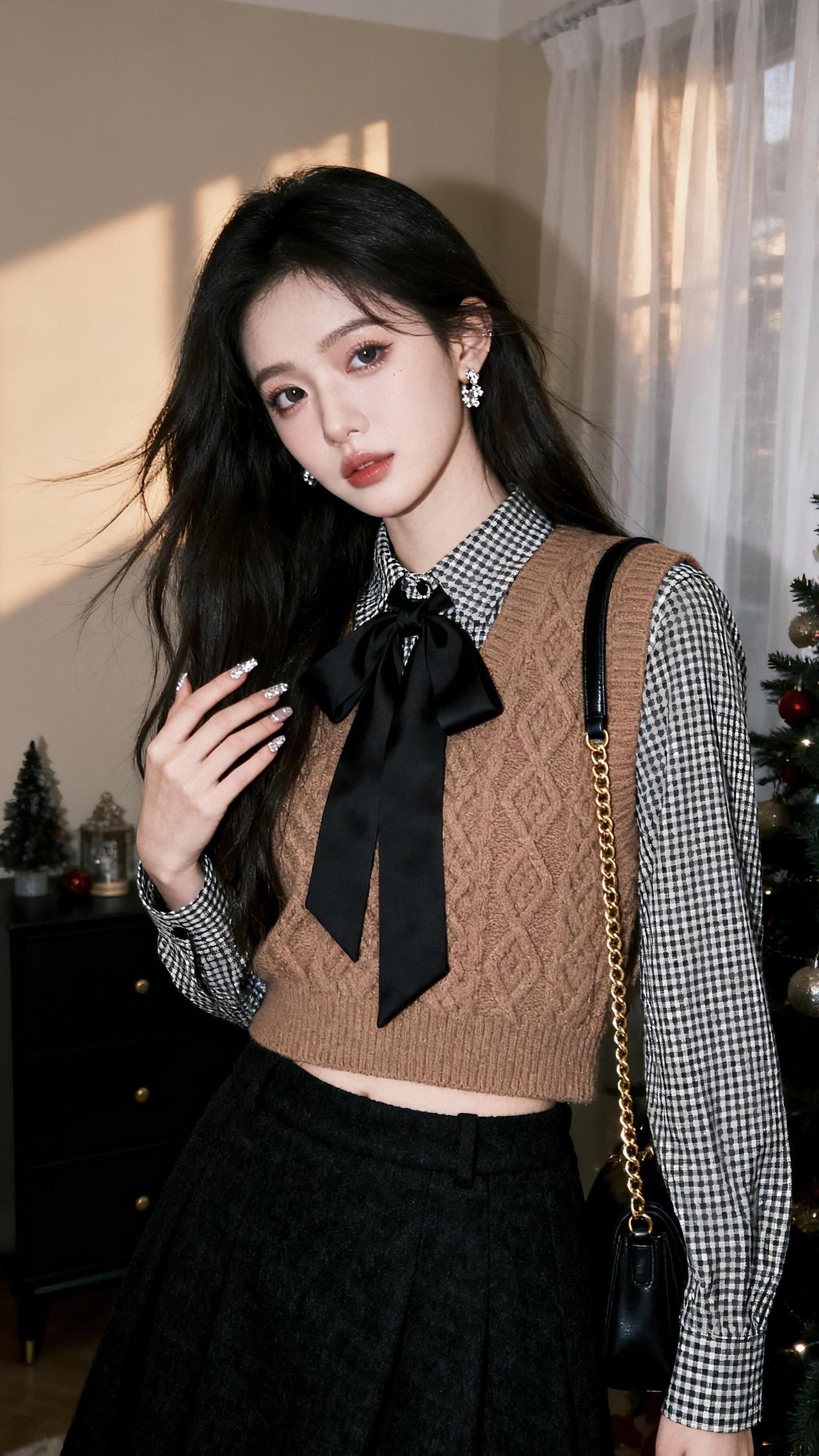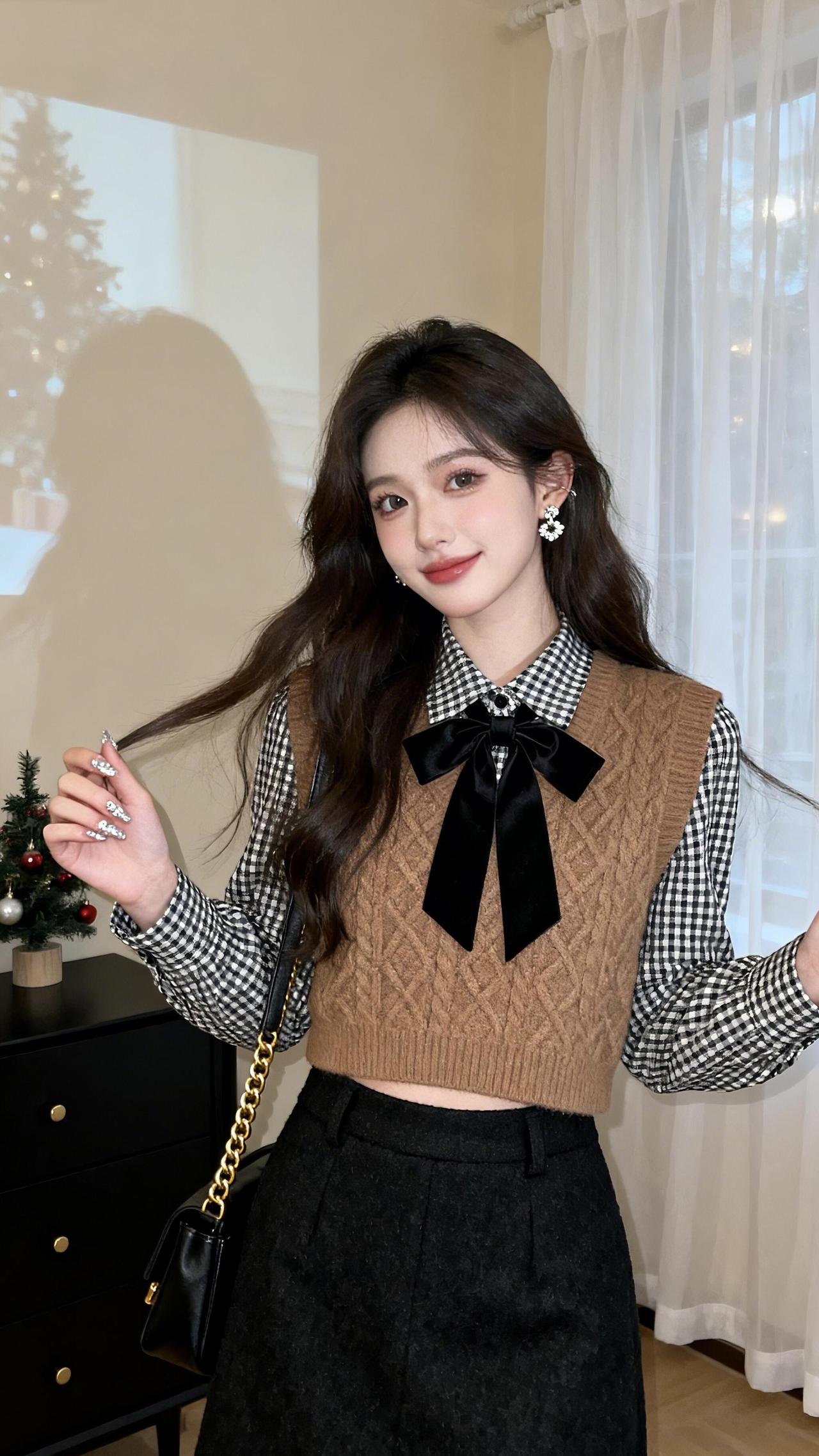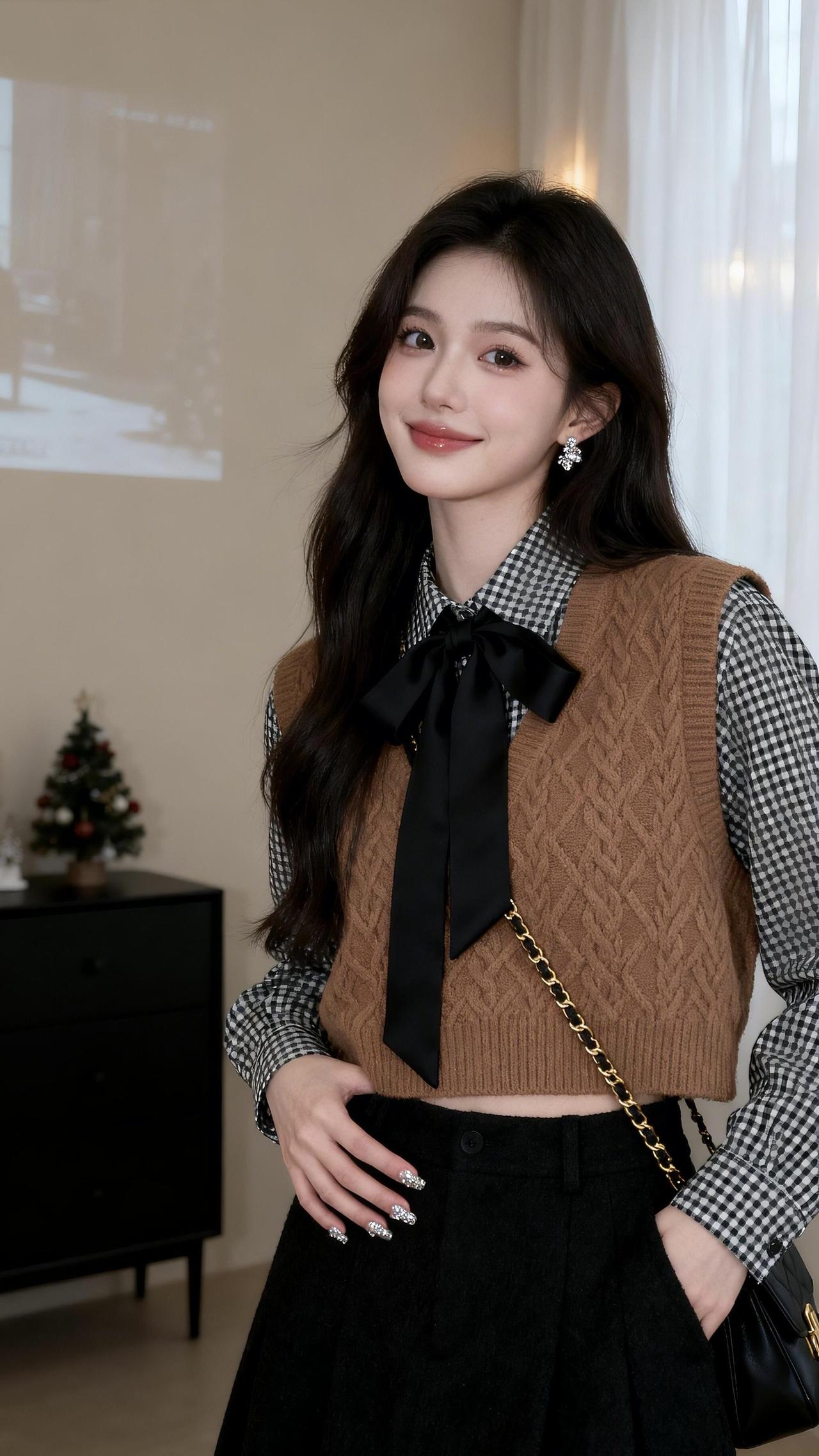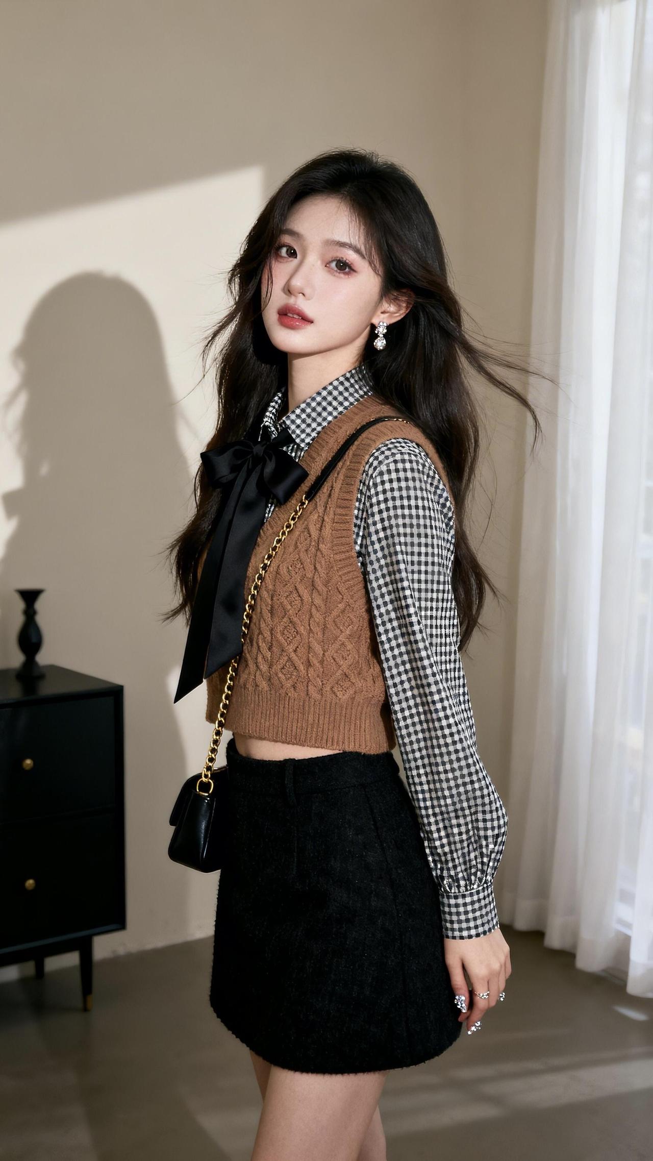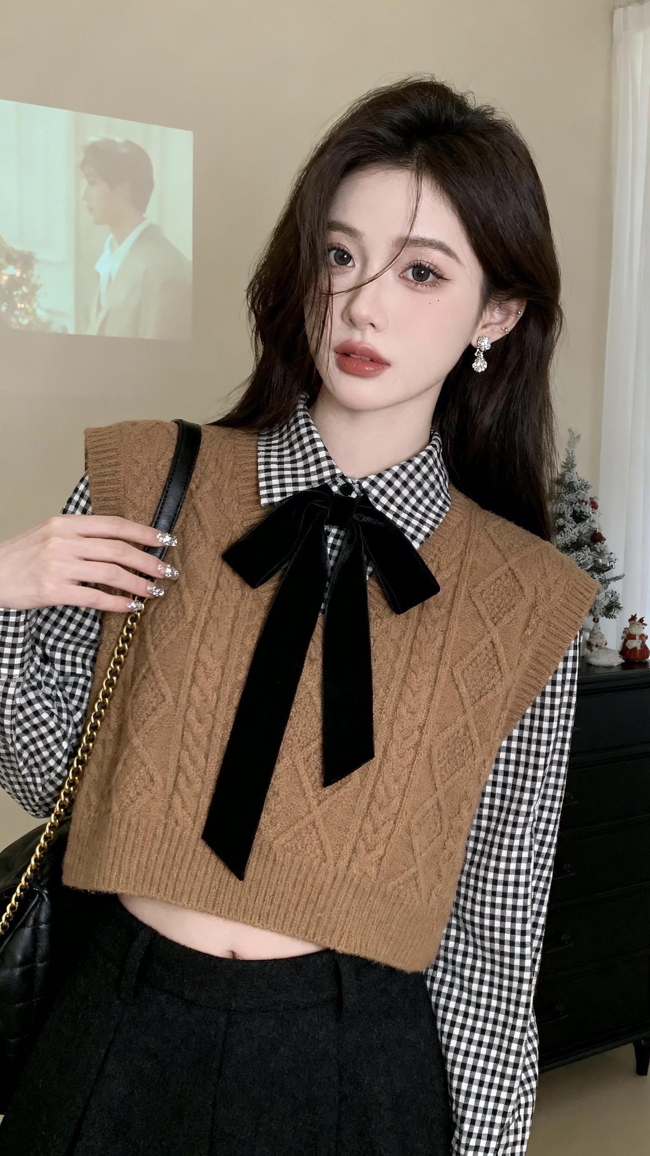 复古甜美风穿搭黑白格衬衫+棕色毛衣背心搭配黑色百褶裙优雅又时尚青春靓丽穿搭