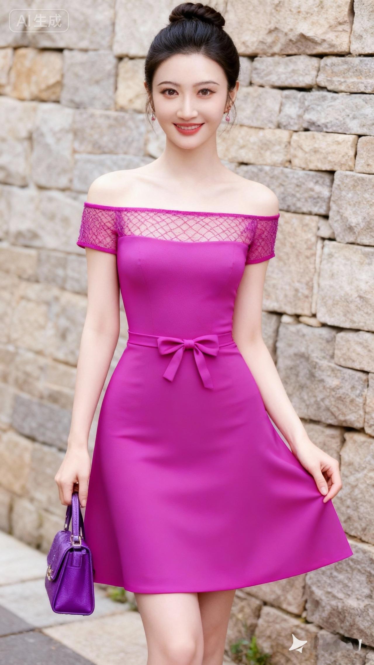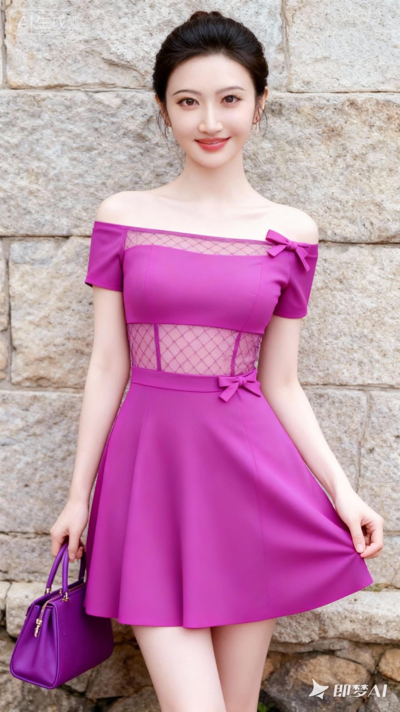 甜美紫色连衣裙,优雅气质,石墙背景,手拿小包,清新自然。