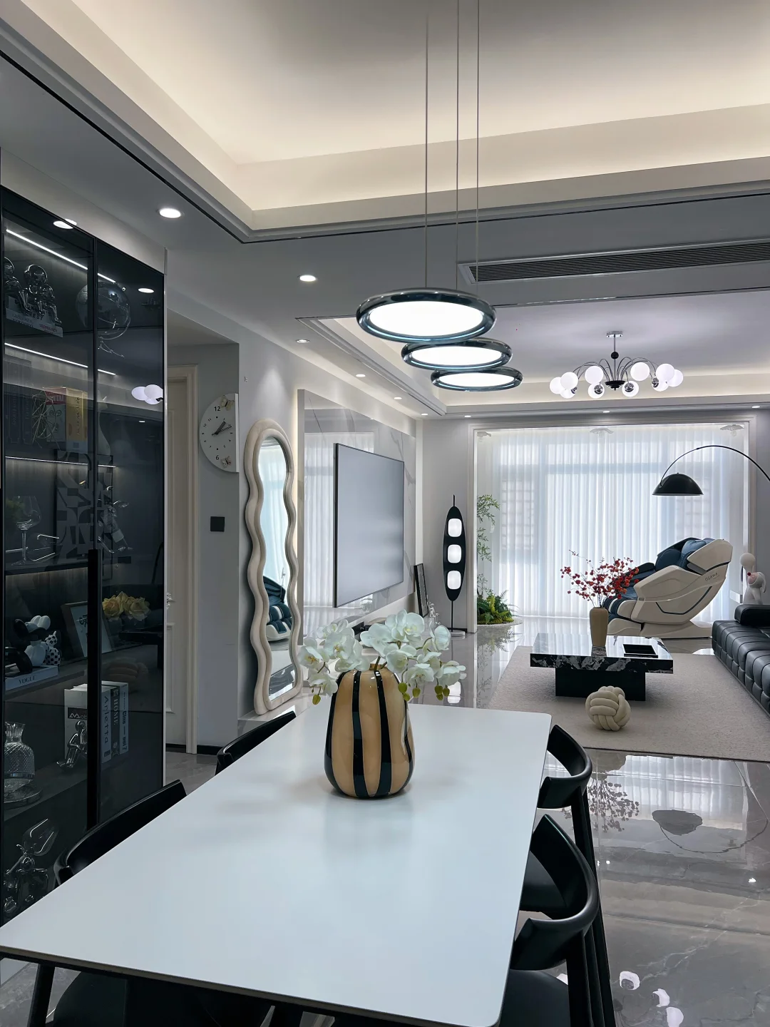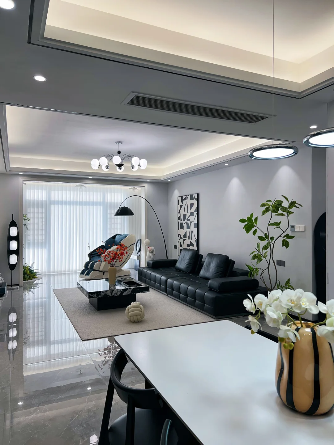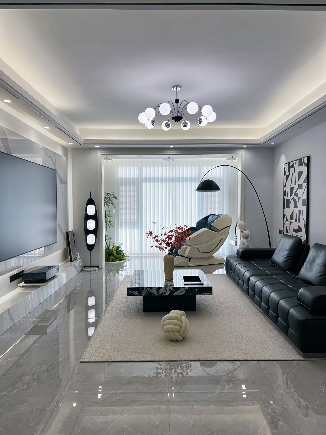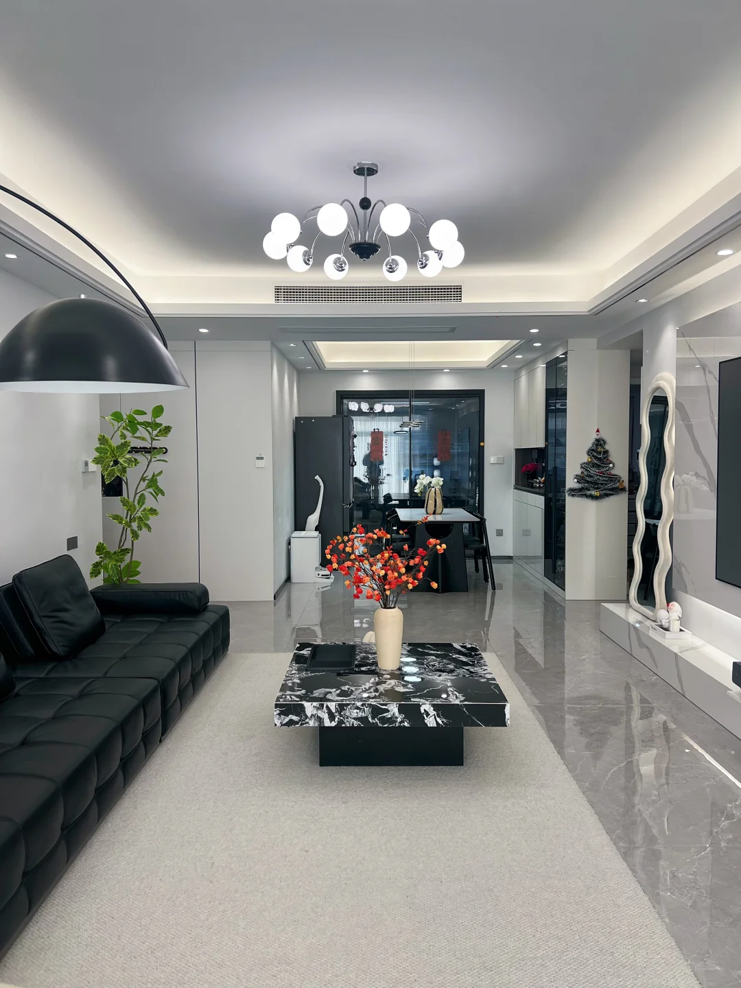 🏠关于我家 我家🏠建筑面积129平,套内108平 硬装花费11w,软装花费19w 拼尽全力装成自己想要的样子~ 没有做复杂的装修,简简单单的硬装 温馨舒适的软装,看着就很舒服! 全程自装,虽然不豪华,但简单温馨! 客餐厅一体,阳台不做推拉门, 边吊一圈回字形吊顶,显得客厅通透又显大! 全屋通刷乳胶漆,环保又好看 没有复杂的电视背景墙,简单的悬浮岩板配上灯带也很高级 软装部分都是黑白灰为主 再搭配灯笼果+秋枫叶的仿真花 红果配橙叶撞进黑白灰客厅,高级感直接拉满 摆在大理石茶几上,和悬浮岩板电视墙绝配 也不用费心打理,过年宅家氛围感直接拉满