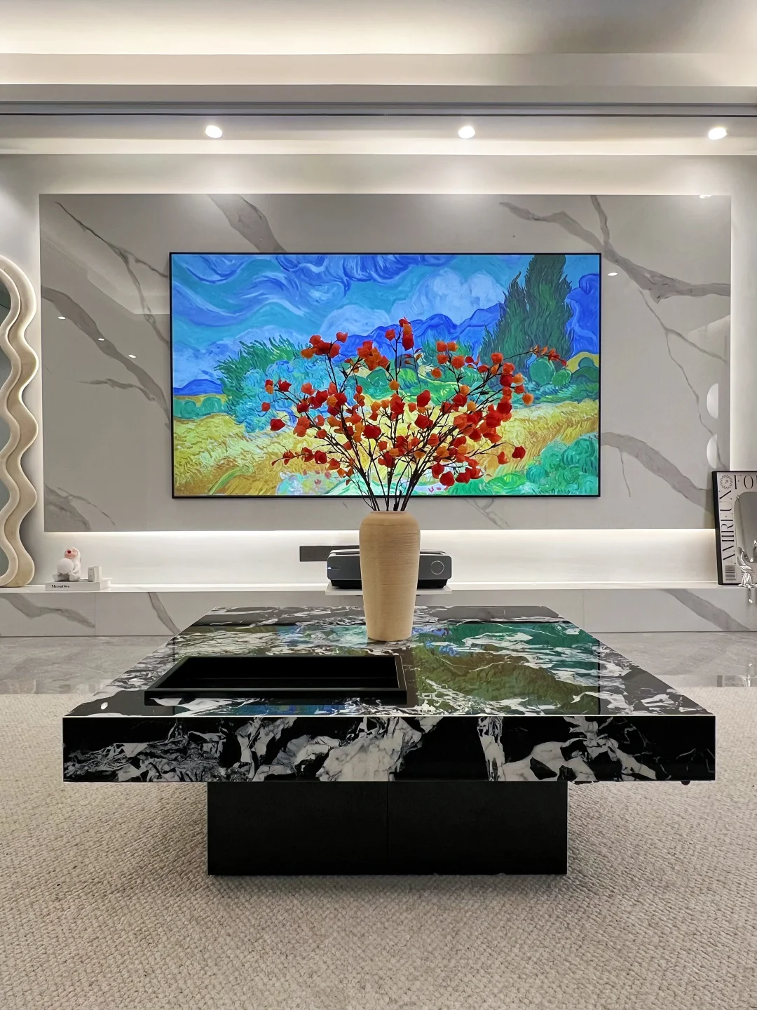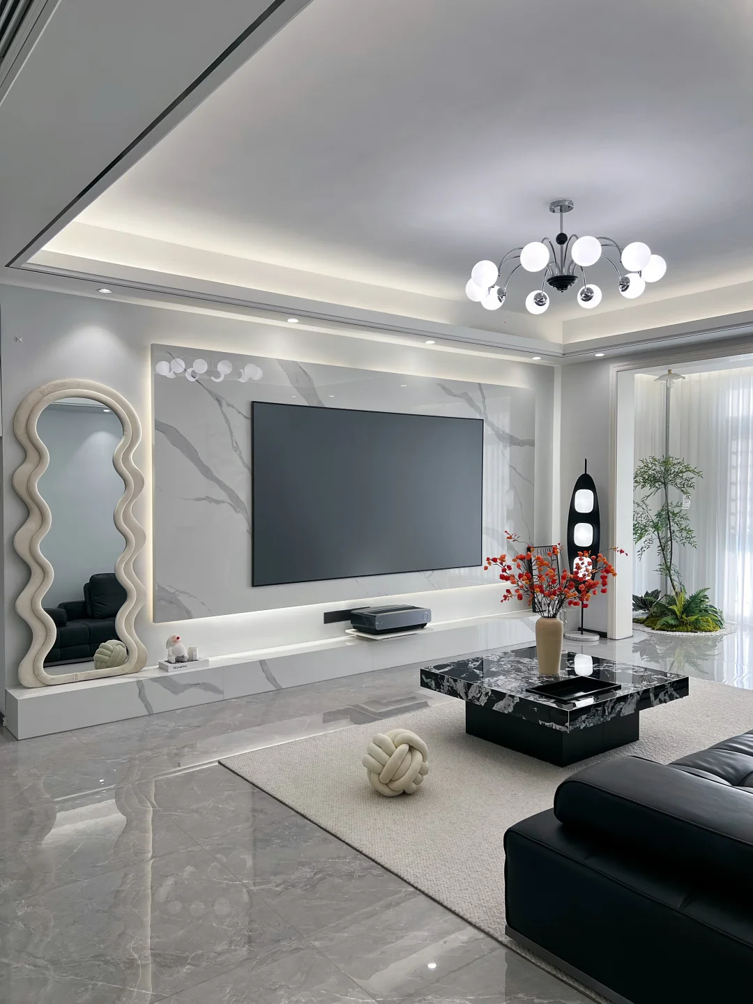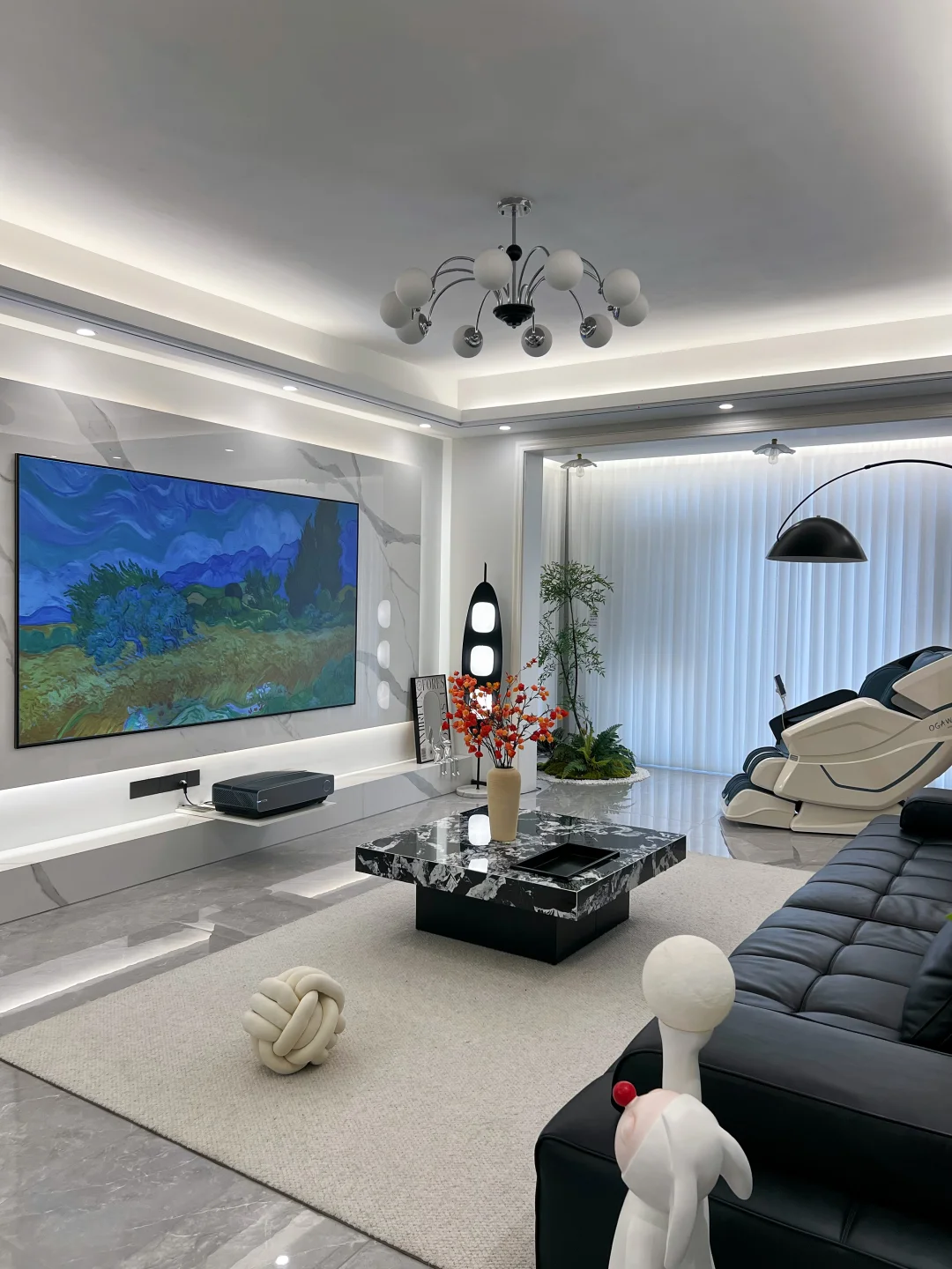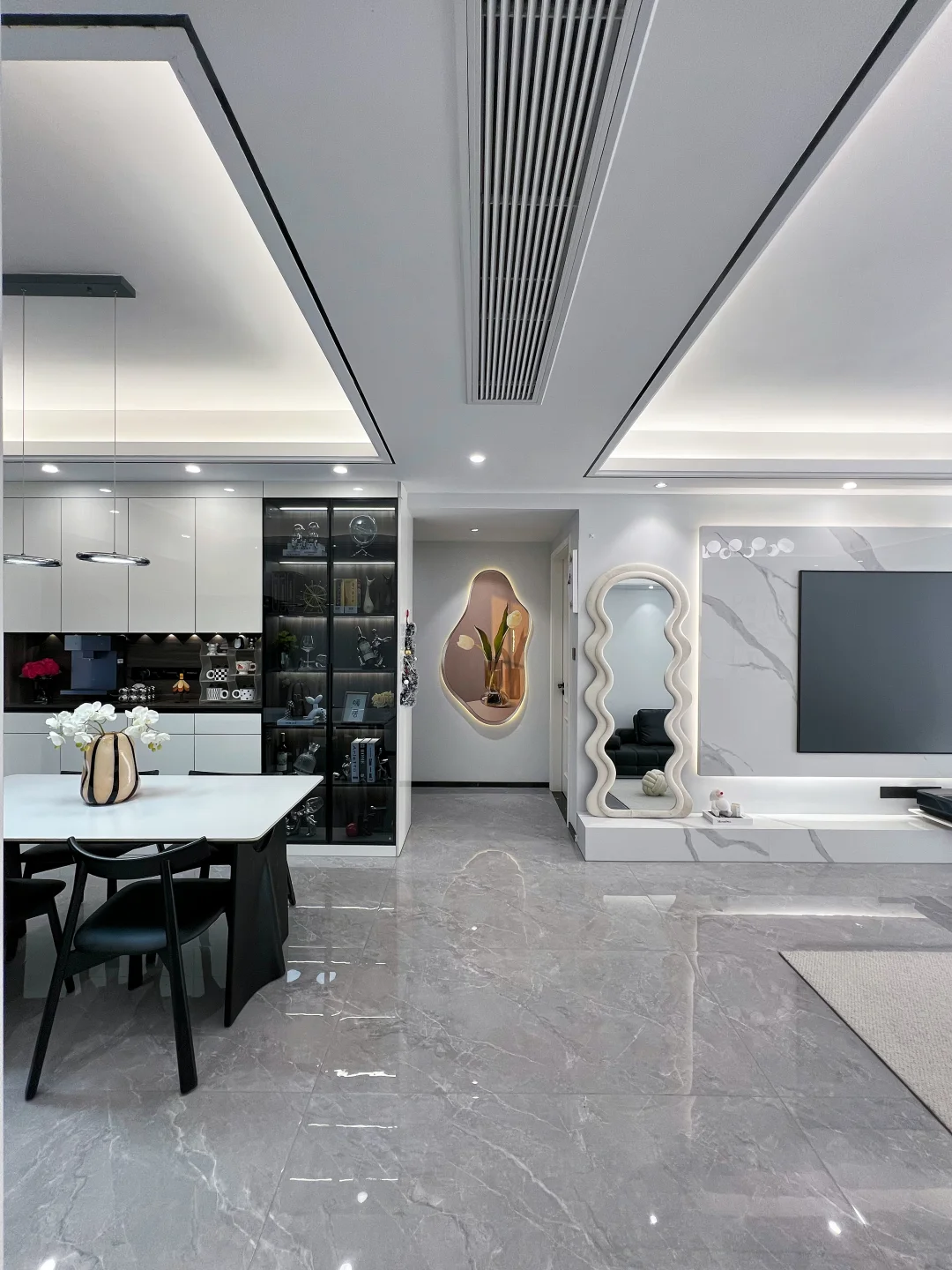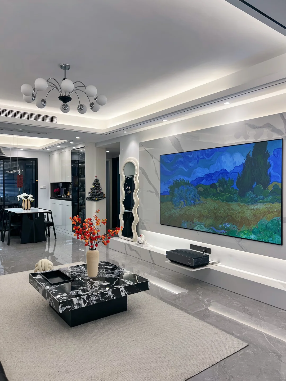 🏠关于我家 我家🏠建筑面积129平,套内108平 硬装花费11w,软装花费19w 拼尽全力装成自己想要的样子~ 没有做复杂的装修,简简单单的硬装 温馨舒适的软装,看着就很舒服! 全程自装,虽然不豪华,但简单温馨! 客餐厅一体,阳台不做推拉门, 边吊一圈回字形吊顶,显得客厅通透又显大! 全屋通刷乳胶漆,环保又好看 没有复杂的电视背景墙,简单的悬浮岩板配上灯带也很高级 软装部分都是黑白灰为主 再搭配灯笼果+秋枫叶的仿真花 红果配橙叶撞进黑白灰客厅,高级感直接拉满 摆在大理石茶几上,和悬浮岩板电视墙绝配 也不用费心打理,过年宅家氛围感直接拉满