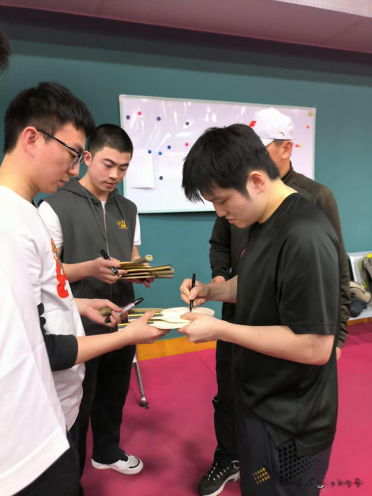 这张是去年体测的时候,樊振东给各省队球员签名时的照片吧?但是我现在才看到,就当是新照片吧。 从照片看得出来,虽然同为乒乓球运动员,大家都非常仰慕樊振东,大家收集了要签名的拍子,找到机会就一起拿给樊振东一起签名。 穿着蝴蝶短袖的樊振东,一口气签了好多球拍。 樊振东毕竟是面部发力创始人,是签名时嘴巴牙齿都会跟着笔峰使劲的,太可爱了。