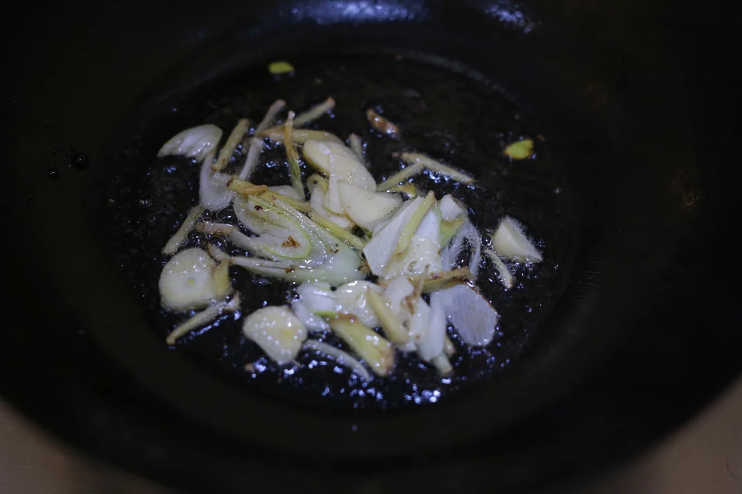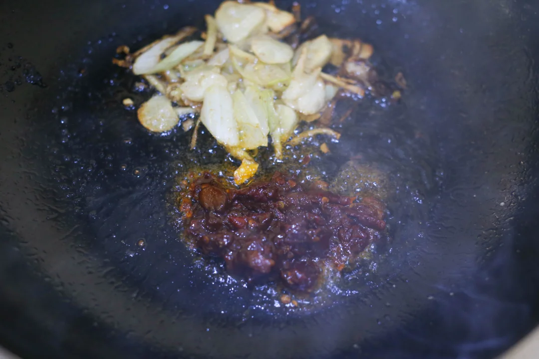 1️⃣:葱姜蒜爆香,炒到金黄色,放到一边,加入一大勺郫县豆瓣酱,炒出红油。