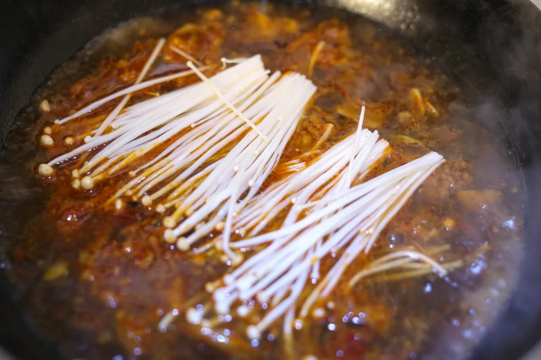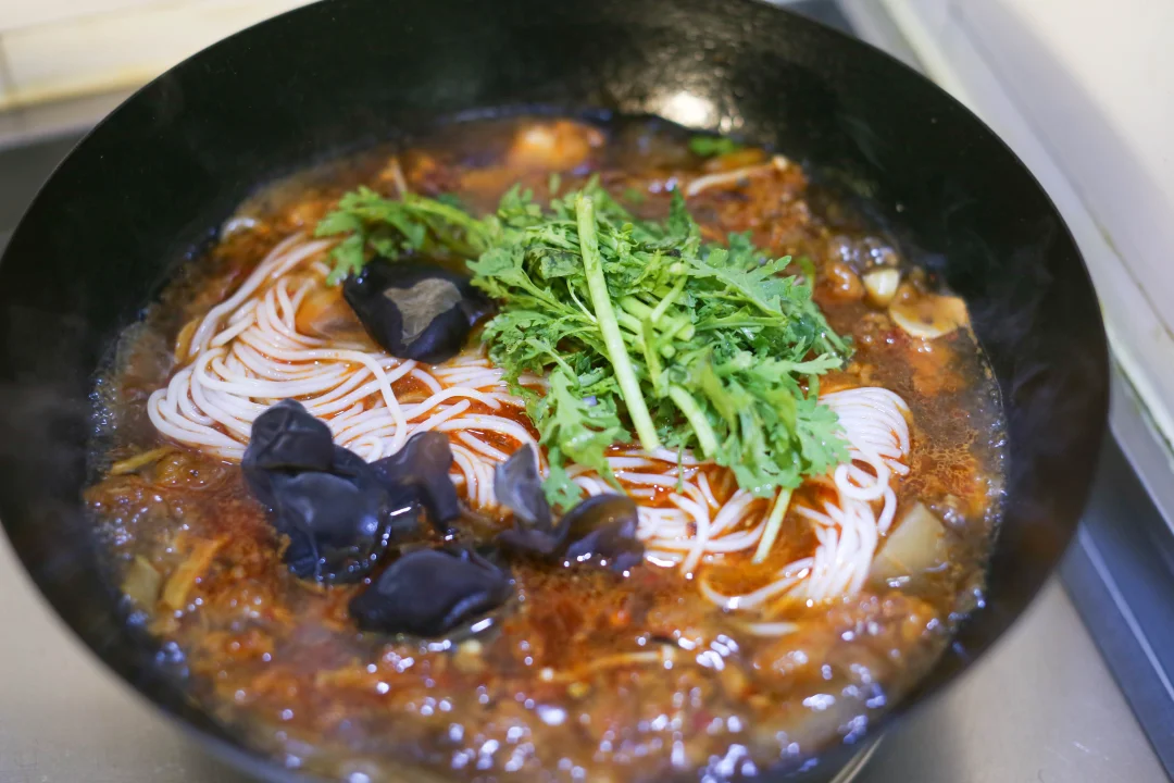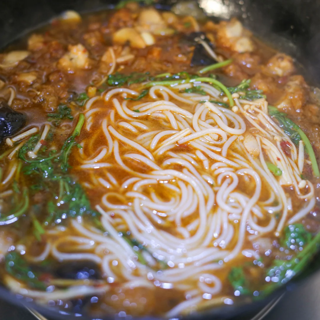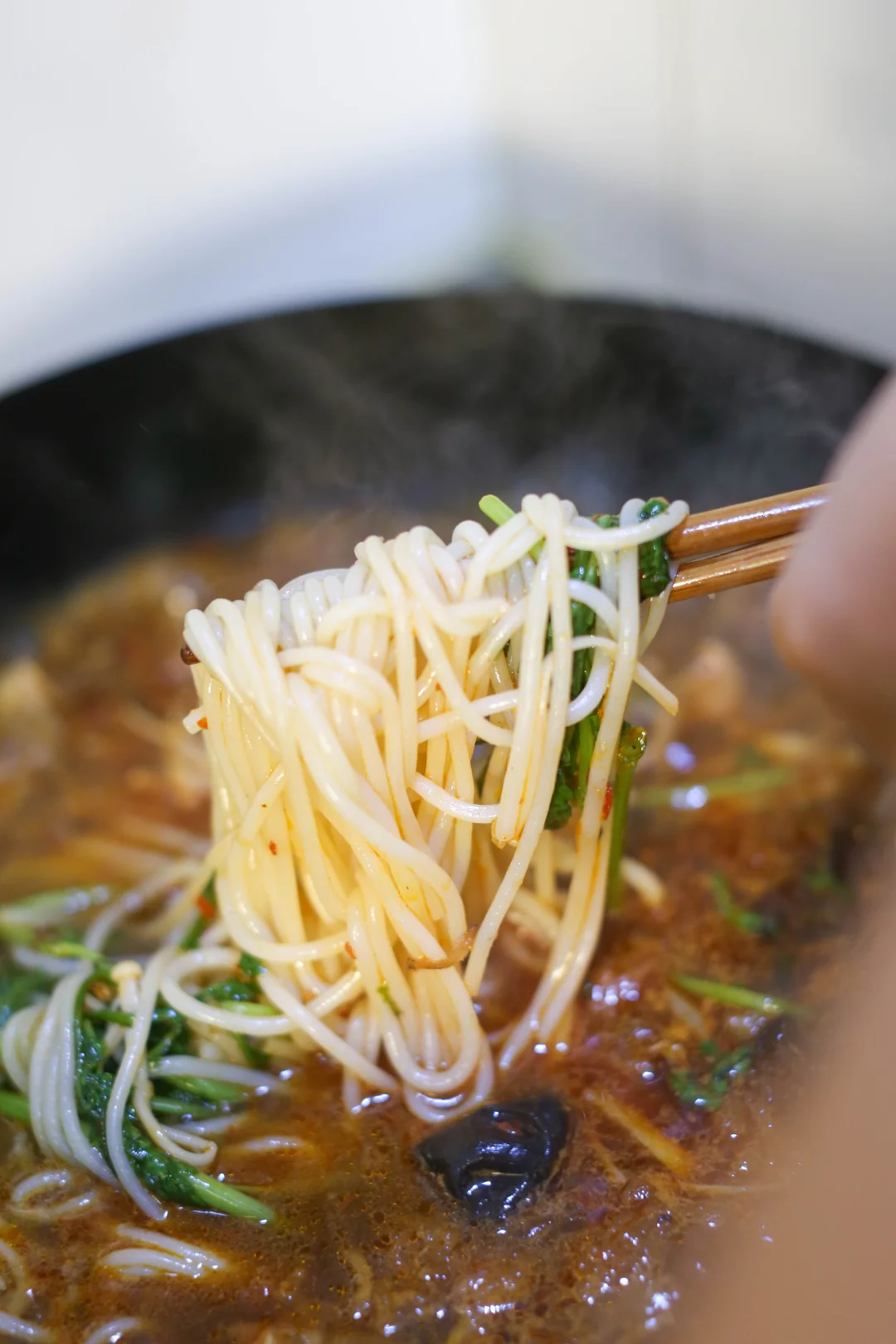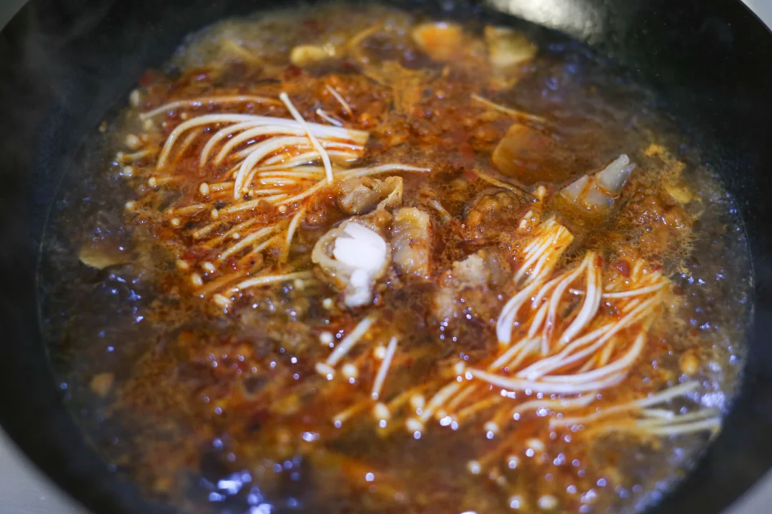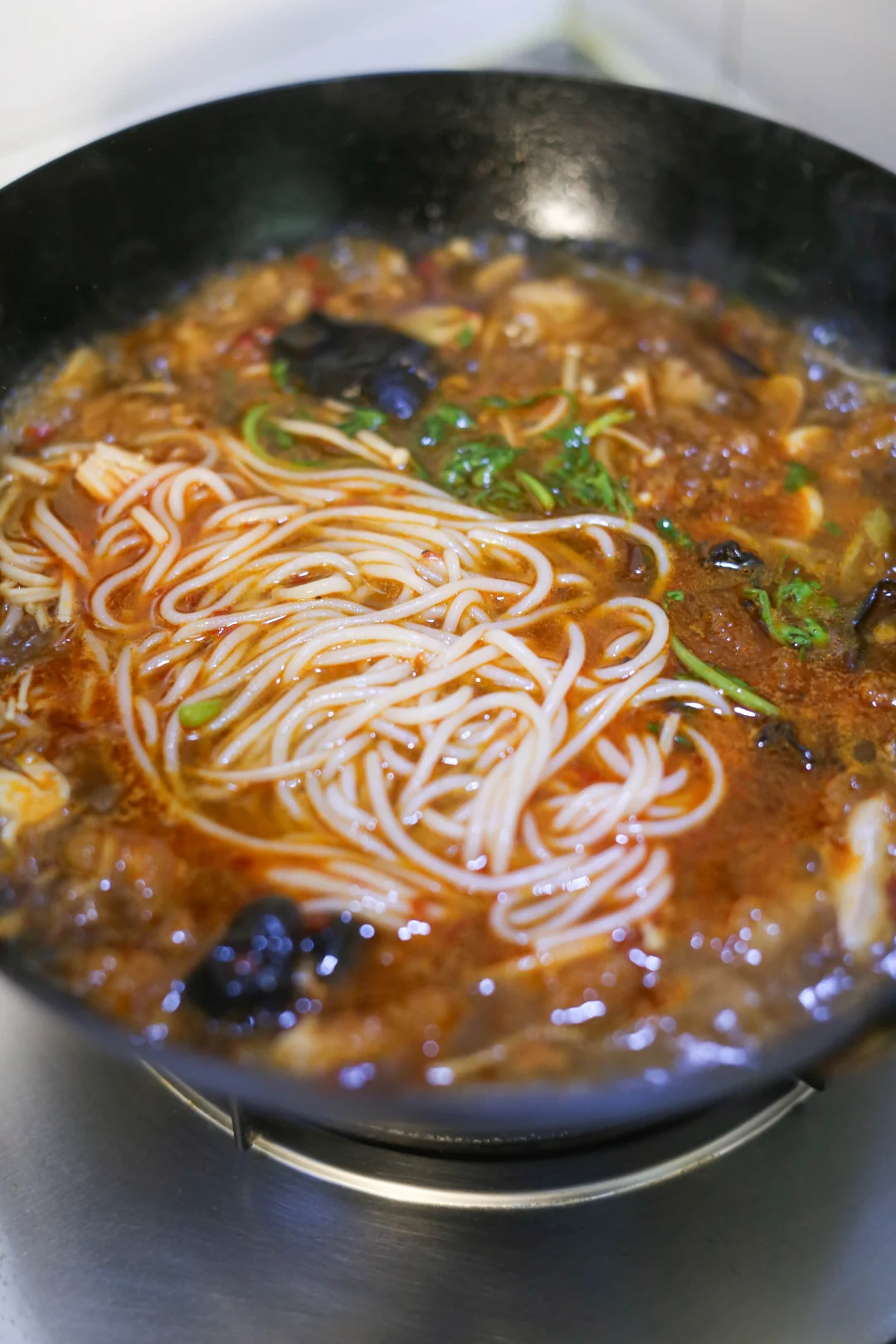3️⃣:加入金针菇、炸好的鸡块切成小块,加入泡好的米粉、黑木耳煮2分钟,米粉煮熟就可以出锅了,加点醋更开胃。