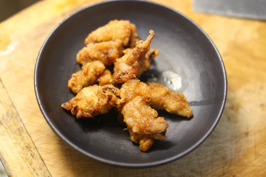 2️⃣:土豆淀粉放入一个空的平盘中,将腌制好的鸡腿肉正反面裹上土豆淀粉,180度油温下锅炸两面金黄,大约3分钟,捞出控油即可。