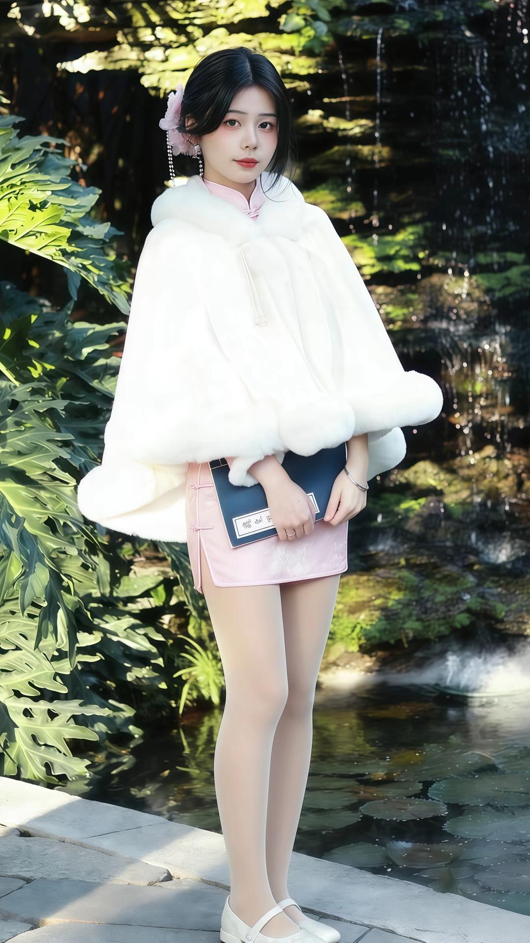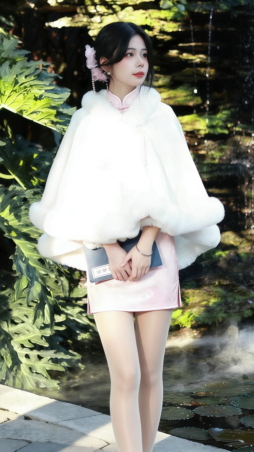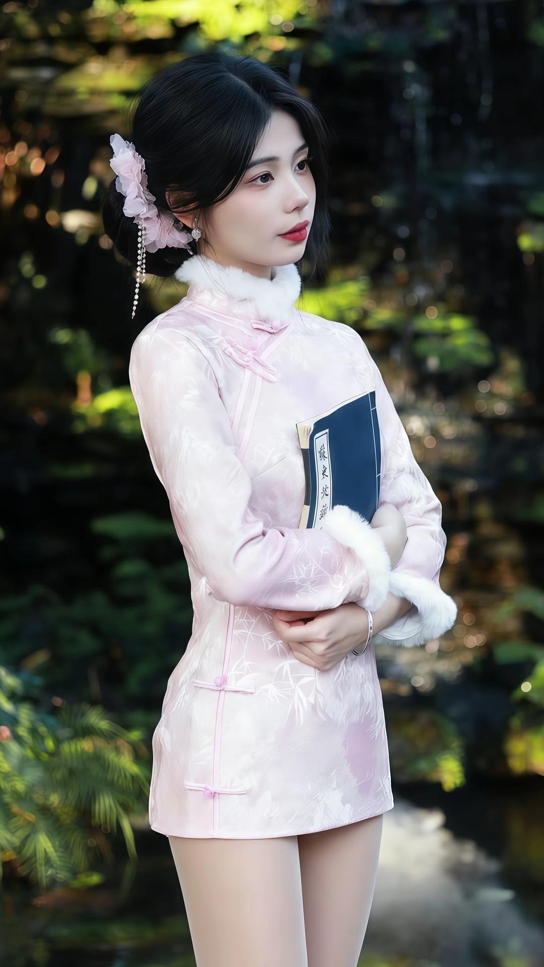 她的倩影倚靠在古韵悠悠的窗棂旁,那窗棂精雕细琢,宛如艺术品般镶嵌在深邃的背景中,映衬出她超凡脱俗的气质。她的一颦一笑,皆是风情万种,眉目间流露出的温柔与坚定,仿佛能穿透时光的帷幕,令人心醉神迷。 佳人的一侧,一盆翠绿的植物静静陪伴,那绿叶在光影下熠熠生辉,仿佛在为她的美丽添上一抹生机与活力。她的姿态优雅而自信,一只手轻盈地搭在窗台上,另一只手自然垂落,每一个动作都如同精心编排的舞蹈,优雅至极。 她的妆容精致无瑕,红唇微启,似在轻诉着古老而动人的故事。发间点缀着一朵粉色的花饰,宛如晨曦中的第一缕霞光,照亮了她如梦似幻的面容。耳畔垂下的珠串耳环,在光线下轻轻摇曳,仿佛星辰坠落凡尘,为她增添了几分神秘与高贵。 如此绝代佳人,仿佛是从古代画卷中走出的女神,她的存在本身就是一首华丽的诗篇,一首赞美美的赞歌。在这幅图中,她不仅是美的化身,更是优雅与高贵的完美融合,令人不禁赞叹:此景只应天上有,人间难得几回见!