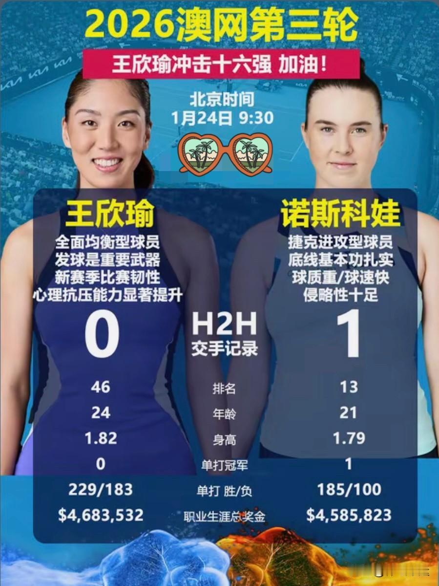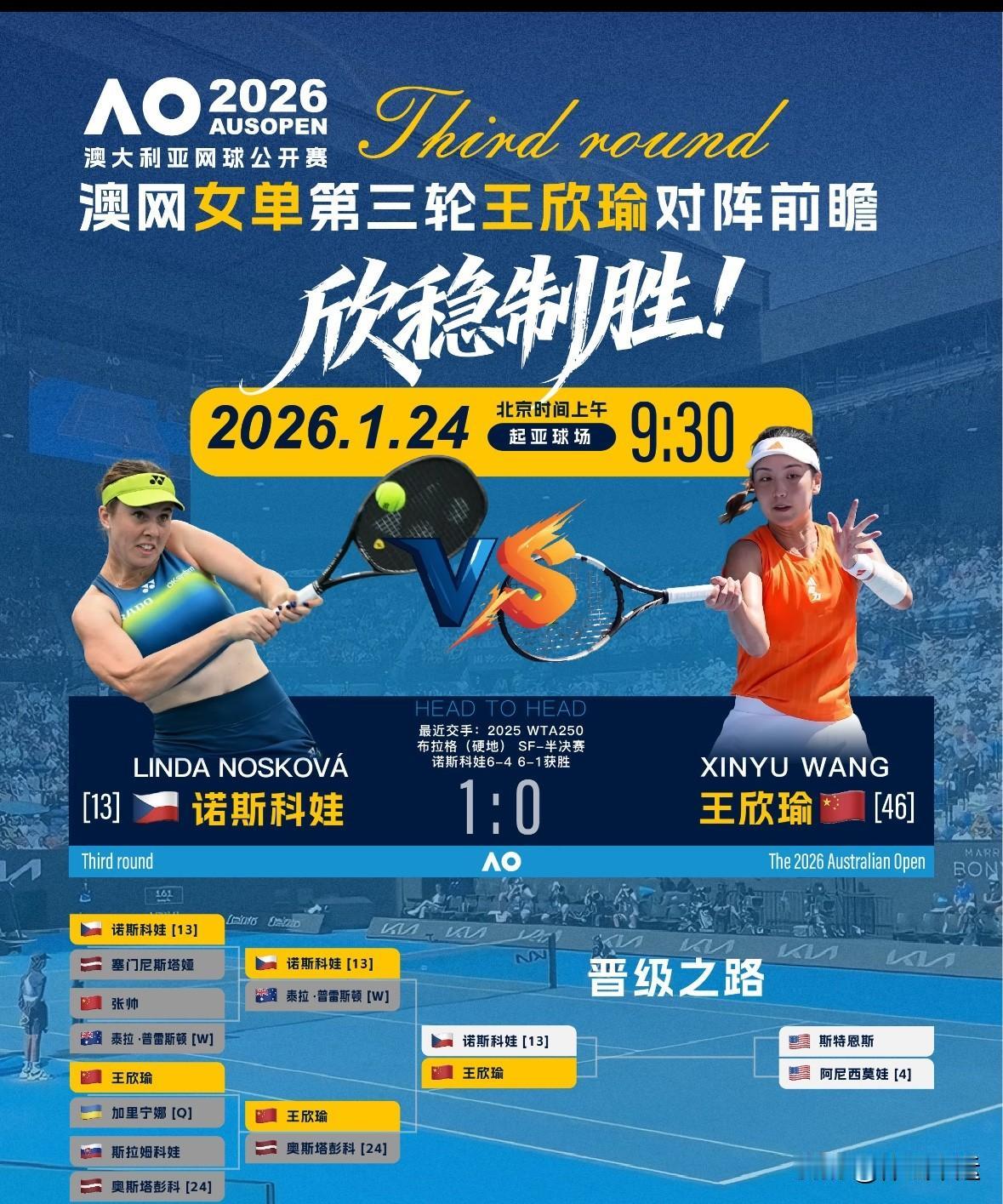 2026年澳网第7比赛日,王欣瑜要向女单16强席位发起冲击了,这着实让人期待! 1月24日上午9时左右,她会在起亚球场对阵赛会女单13号种子、捷克女将诺斯科娃。王欣瑜已经创造历史,首次杀入澳网女单第三轮,解锁四大满贯女单32强! 她能否突破自己再进一步?比赛充满未知,但王欣瑜的拼搏精神肯定会让比赛很精彩,真心希望她能晋级16强! 2026澳网 澳网名单