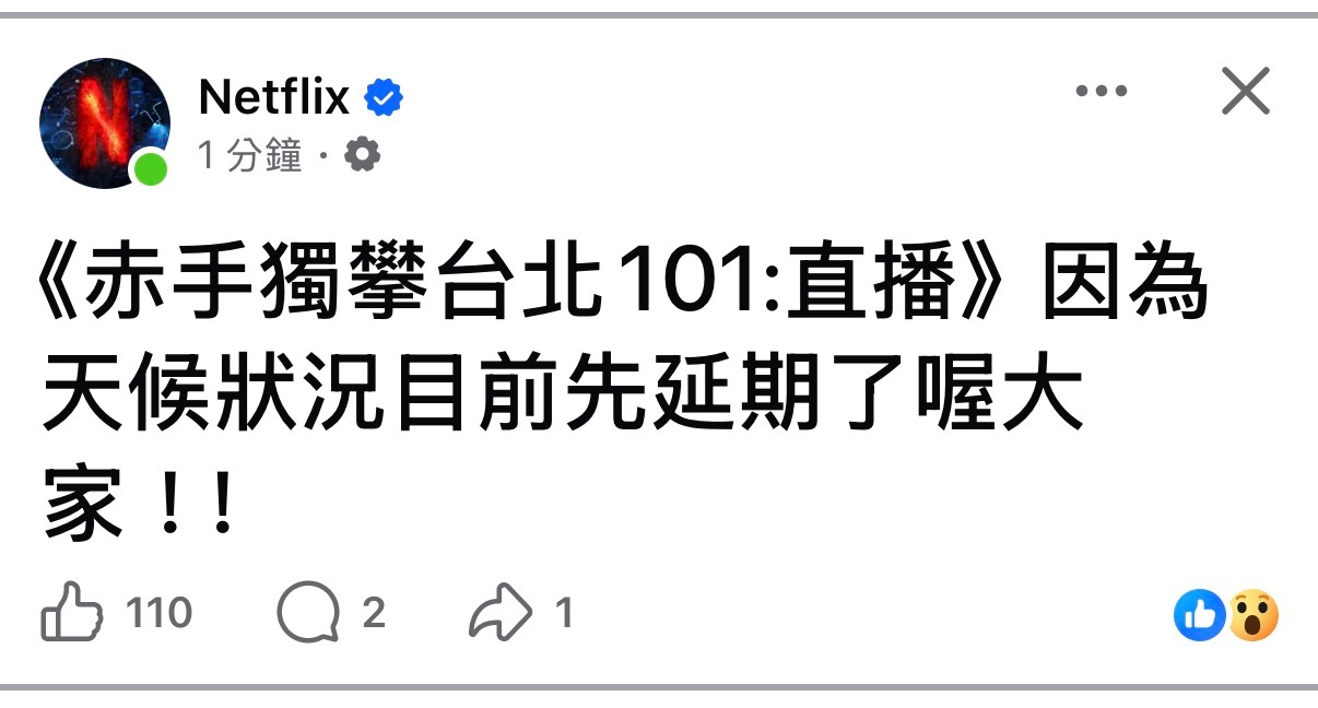 介于目前天气状况,Netflix发布通知,Alex Honnold徒手攀爬台北101 目前先延期!!! 改成明天