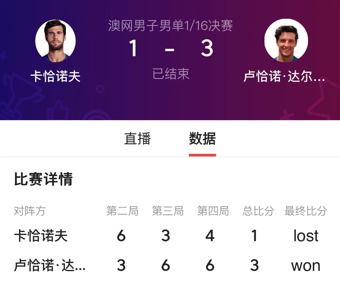 ✅澳网男单第三轮比赛战报🆕⬇️⬇️ 1️⃣15号种子俄罗斯卡恰诺夫6-7、6-3、3-6、4-6不敌22号种子意大利达尔德里无缘男单16强!卡恰诺夫成为卢布列夫、福基纳、诺里、蒂亚福、穆泰之后第三轮出局的第六位种子选手!