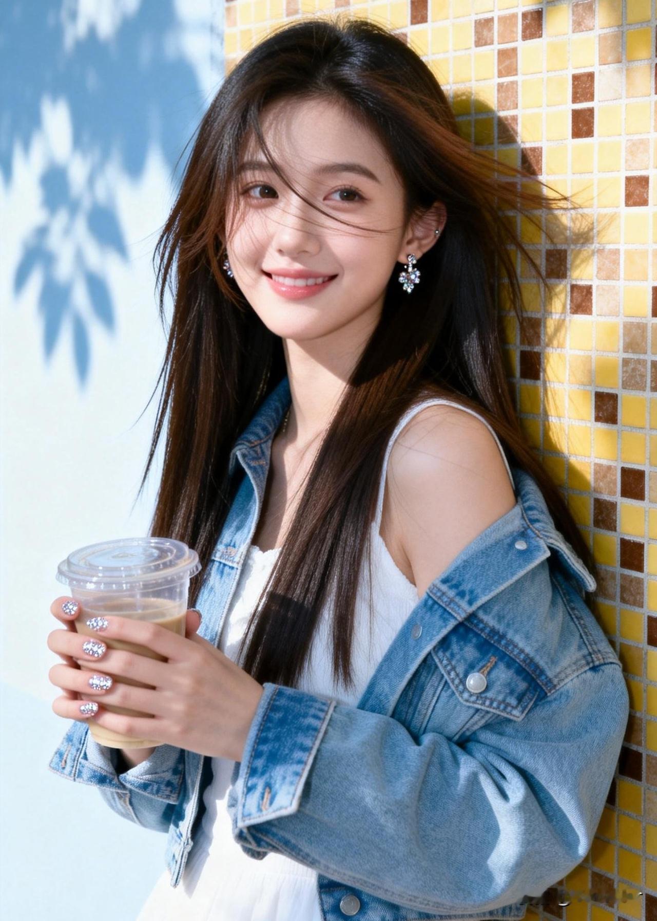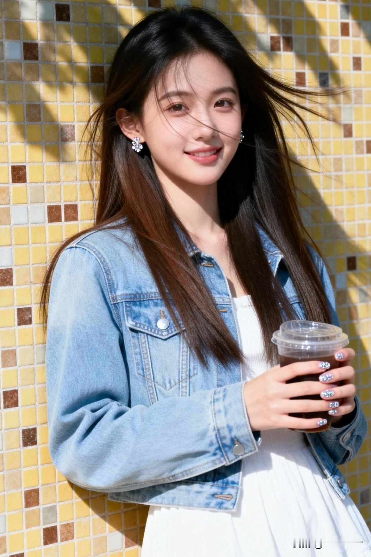 阳光明媚的午后,少女轻抚发丝,手捧冰饮,微笑如花。