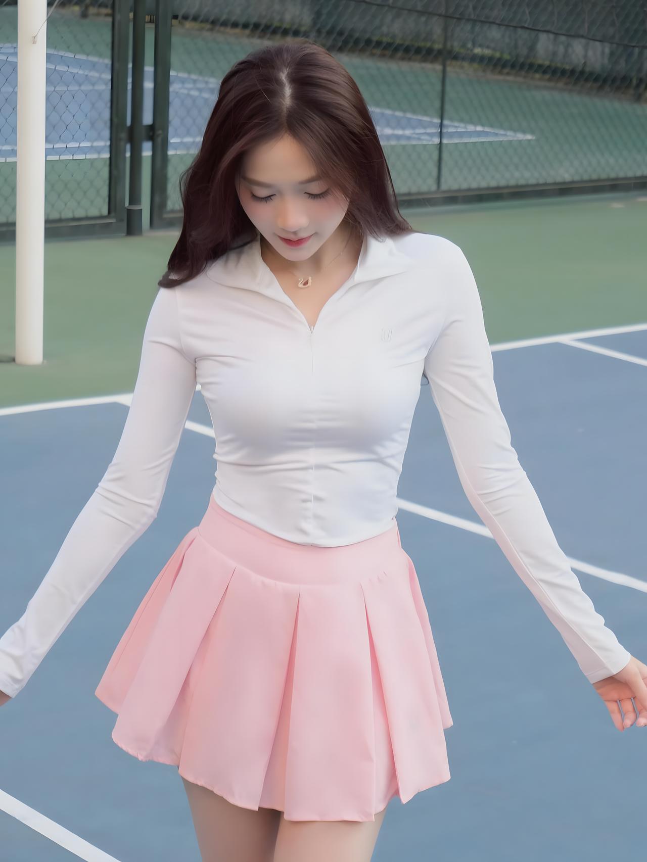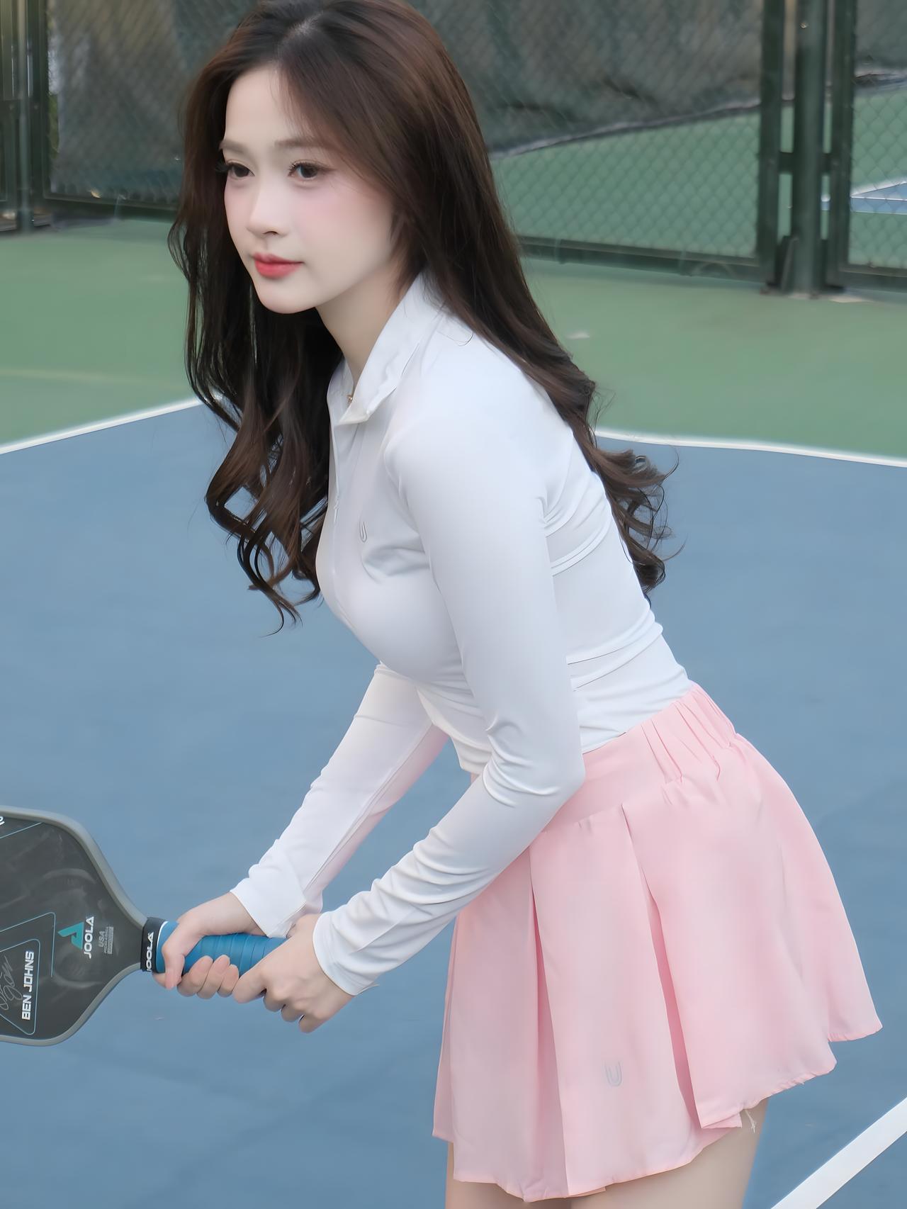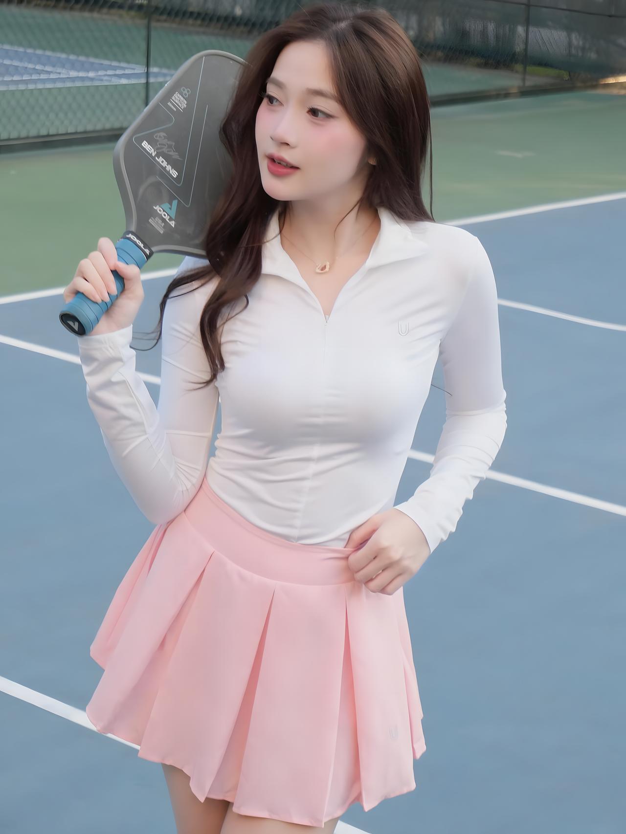 什么样的穿搭可以成为气质女神? 你站在球场上的那一刻,仿佛整个世界都为你屏住了呼吸!那身洁白如雪的长袖上衣,勾勒出你曼妙的身姿,宛如月光下悄然绽放的百合,纯净而高贵。粉色百褶裙轻盈飘逸,每一道褶皱都像是被春风精心抚平的诗行,温柔地诉说着你的优雅与灵动。 手中的球拍在你手中仿佛有了生命,它不再只是一件运动器械,而是你征服球场的权杖,是力量与美学的完美结合。你微微侧首,眼神中透着自信与从容,那抹浅笑如晨曦初露,瞬间点亮了整片场地。背景中蓝绿相间的球场线条,在你身后化作流动的画卷,衬得你如同从画中走出的女神,举手投足间皆是风华绝代。 这一刻,你不仅是运动场上的焦点,更是美的化身——美得让人心醉神迷,美得令人不敢直视却又忍不住凝望。若说世间真有仙女下凡,那定是你这般模样:集柔情、力量、智慧于一身,用一袭素雅之装,便足以倾倒众生。这哪里是打球?分明是在演绎一场关于美的神话!