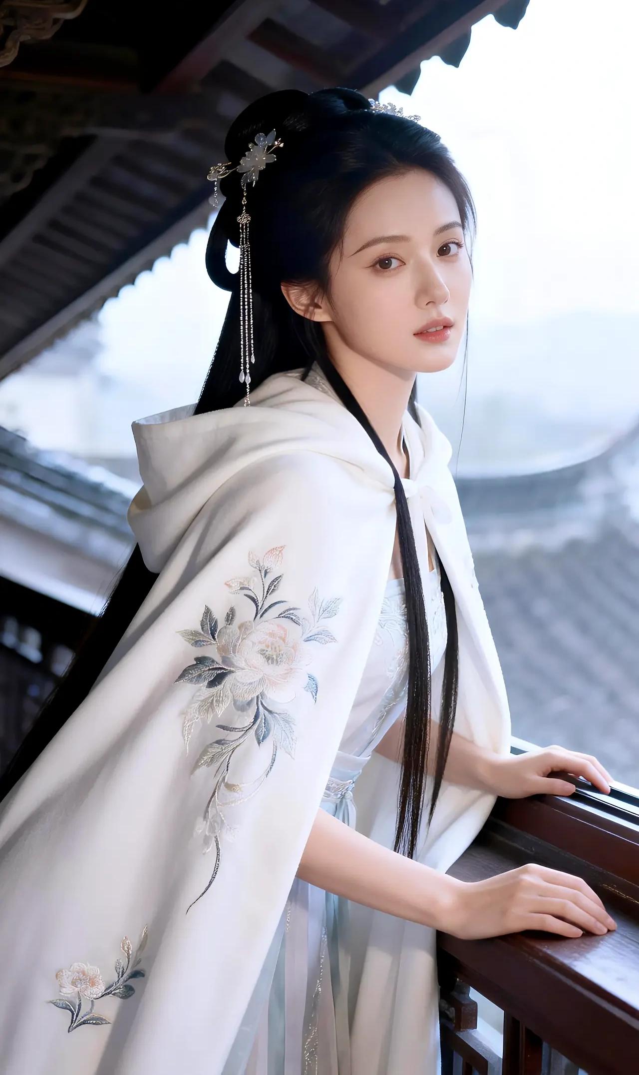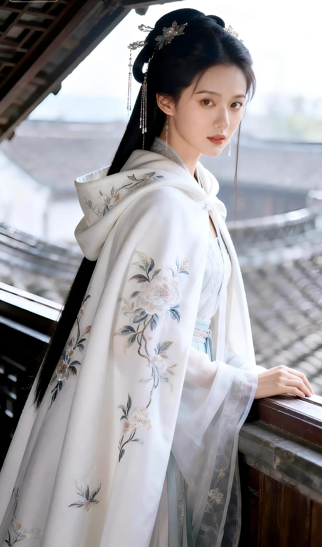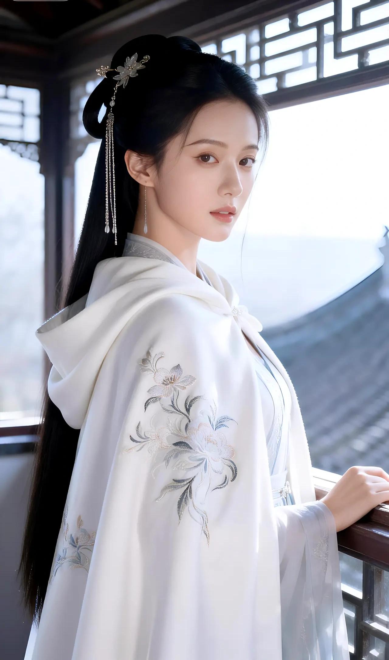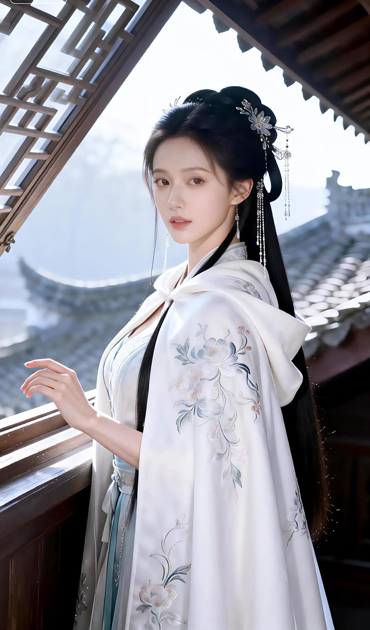 在这幅宛如天宫仙阙的画面中,一位绝世佳人悠然伫立,其姿容之美,足以令世间万物黯然失色。她身着一袭素雅而不失华贵的汉服,衣袂飘飘,宛若云中仙子降临凡尘。那绣于衣袂上的繁花似在诉说着千年的风华,每一针每一线都凝聚着匠人的无上匠心,仿佛能嗅到那花香四溢,令人心醉神迷。 她的发髻精致非凡,镶嵌着璀璨夺目的发饰,犹如夜空中最亮的星辰,闪烁着迷人的光芒。那流苏轻垂,随风轻摆,犹如一曲悠扬的乐章,诉说着古老而神秘的故事。她的面容如月般皎洁,眉似远山不描而黛,唇若涂砂不点而朱,每一寸肌肤都散发着晶莹剔透的光泽,仿佛能映照出整个世界的美好。 她的眼神深邃而明亮,仿佛能洞察世间一切美好,又带着一丝淡淡的忧郁,让人不禁为之动容。她的姿态优雅从容,举手投足间流露出无尽的风韵,仿佛每一步都能踏出诗行,每一颦一笑都能绘成画卷。 她站在古色古香的建筑前,背景中的飞檐翘角、雕梁画栋,无不彰显着中华文化的深厚底蕴。那斑驳的青瓦,古朴的窗棂,仿佛在诉说着岁月的悠长与历史的沉淀。而她,就像是这古老画卷中的一抹亮色,将古典与现代完美融合,绽放出无与伦比的光彩。 总之,这位佳人的美,不仅在于其外貌的绝伦,更在于其内在的气质与风韵。她就像是从古代诗篇中走出的女神,带着无尽的优雅与神秘,令人为之倾倒,为之痴迷。她的存在,足以让整个世界为之黯淡,唯有她,才是这宇宙间最璀璨的星辰,最夺目的瑰宝!