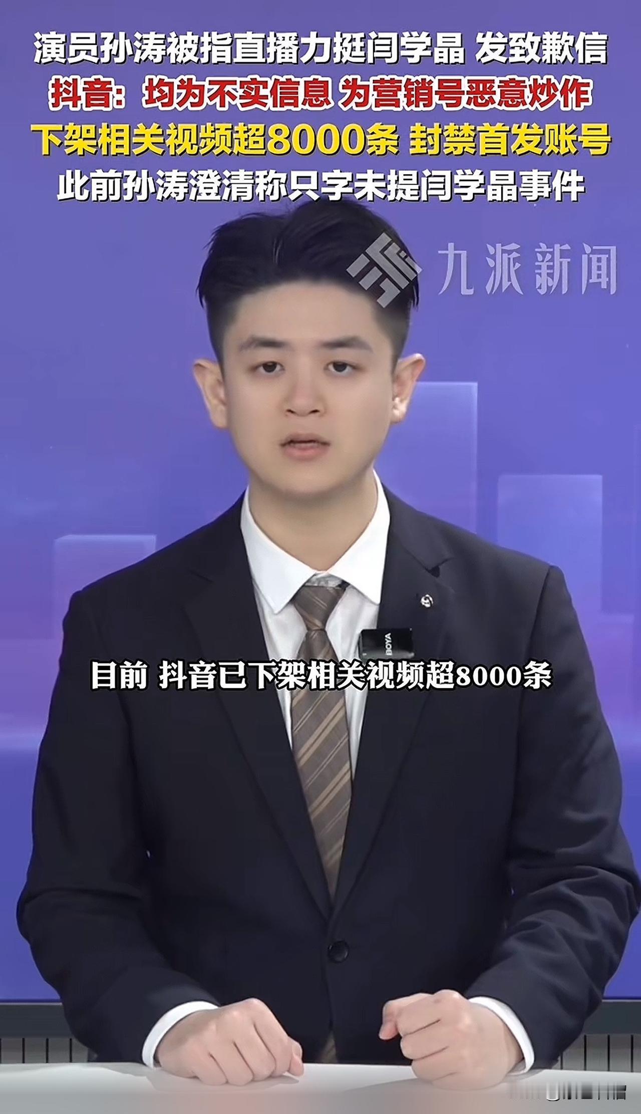 演员孙涛力挺闫学晶一事出现反转,抖音官方出面为他澄清! 原来,孙涛从未在直播时说过任何力挺闫学晶的话,这一切都是营销号炒作出来的。看来,孙涛作为闫学晶曾经的搭档,此次被无故诬陷,真可谓天降横祸,甚至差点断送了他的演艺生涯。 为此,孙涛本人昨天也特地发了一条长视频讲清楚事情始末,以图为自己讨回一个公道。 目前,抖音官方已下架超8000条相关视频,并对首发账号作了封禁处理。 不得不说,有些营销号为了流量,真是毫无底线,无中生有的事都能编造出来。 在此也要提醒广大网友,网络并非法外之地。无论何人,无故造谣生事,最终都要付出惨痛代价。 (图片来源网络)