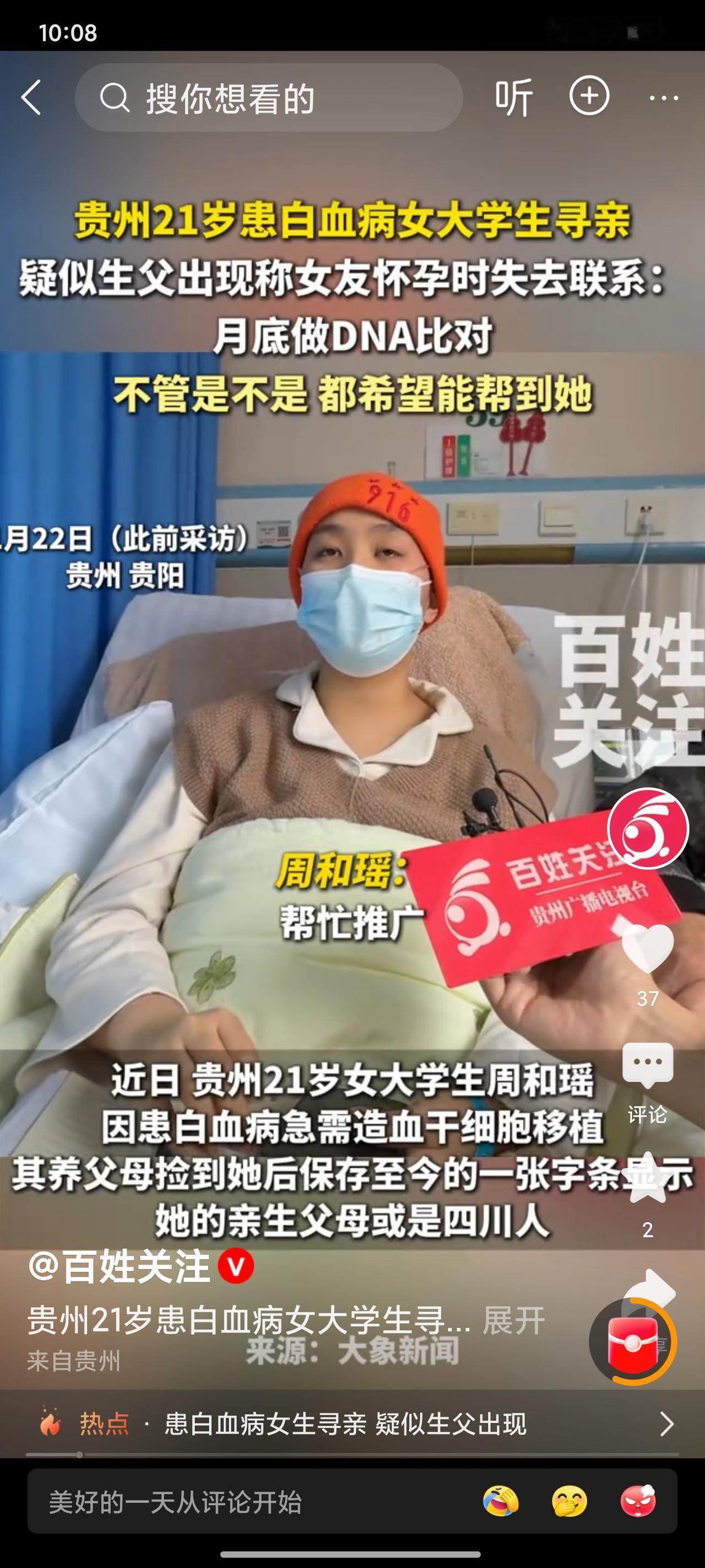 🔥揪心!21岁白血病女大学生寻亲有新进展,四川简阳疑似生父现身,一句话戳中全网泪点! 21岁的周和瑶,扬州大学音乐学院的姑娘,本该在校园里绽放青春,却被急性混合型白血病缠上,造血干细胞移植成了唯一的生路。 养父母第一时间配型,结果却不尽如人意,走投无路下,藏了21年的身世秘密再也瞒不住了——姑娘是收养的,亲生父母疑似四川人,当年只留下一张字条! 得知身世的姑娘没有怨怼,只有求生的期盼:理解他们当年的无奈,只求能给我一次活下去的机会❤️ 养父母的爱真的太戳人了,藏了二十多年从不敢提,怕孩子心里有疙瘩,如今为了救命,哪怕揭开伤疤也要拼尽全力,这才是刻在骨子里的爱啊! 寻亲消息一出,三地媒体联动,全网网友接力转发,今天终于等来关键消息! 一位四川简阳的大哥主动联系养父母,说看到寻亲信息后,越看越觉得姑娘像自己的女儿,过往的经历和时间线也完全对上! 他现在在海上跑运输,信号时好时坏,要月底到厦门才能抽血做DNA,还撂下一句超有担当的话:不管是不是我的女儿,我都想帮她一把! 更让人心疼的是这个家庭的处境:养父有眼疾,没法做生意只能打零工,全家就靠一千多的退休金过活,养母一个人在医院日夜守着女儿,经济和精力都扛到了极限。 万幸的是,寻亲后各地的爱心捐款不断涌来,陌生的善意成了这个家庭最暖的慰藉。 💬网友的评论看一次暖一次: ✅“养父母才是真正的亲人,二十多年的悉心养育,比血缘更珍贵!” ✅“四川大哥太爷们了!不管是不是亲生的,这份挺身而出的善良就值得所有人点赞!” ✅“21岁的年纪,花一样的年华,一定要挺过去啊,全网都在为你祈福!” ✅“希望这就是亲生父女,配型一次成功,让姑娘早日康复回到校园!” 👉作为小编,看到这一幕真的狠狠破防了! 血缘或许是天生的,但善良和温暖从来都是自己的选择。养父母的倾尽所有,素未谋面大哥的仗义援手,还有全网陌生人的爱心接力,这些美好远比血缘更动人。 哪怕最后DNA比对结果不如愿,这份沉甸甸的善意,也足够温暖姑娘的求生路。 现在,所有人都在等月底的DNA结果,盼着配型顺利,也盼着有更多专业的白血病治疗医院能关注到姑娘,为她提供更优质的救治资源! 愿这个勇敢的姑娘能被命运温柔以待,愿所有的善意都能汇聚成光,照亮她的重生之路! 一起为周和瑶祈福,坐等好消息🙏