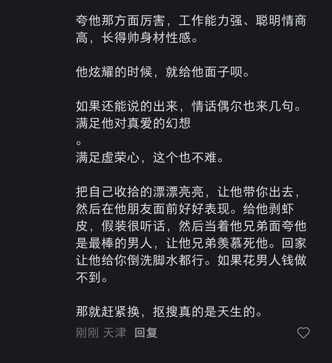 我跟你说,今天刷到一个东西,给我看傻了。叫什么“驾驭女人的7大秘诀”。什么先