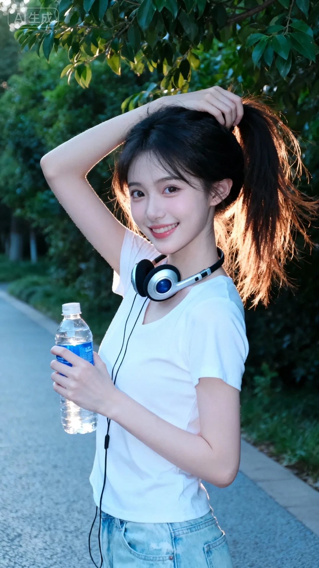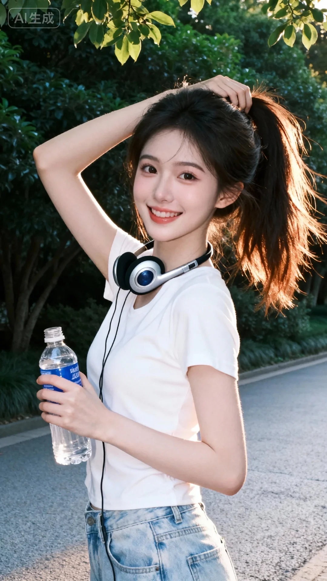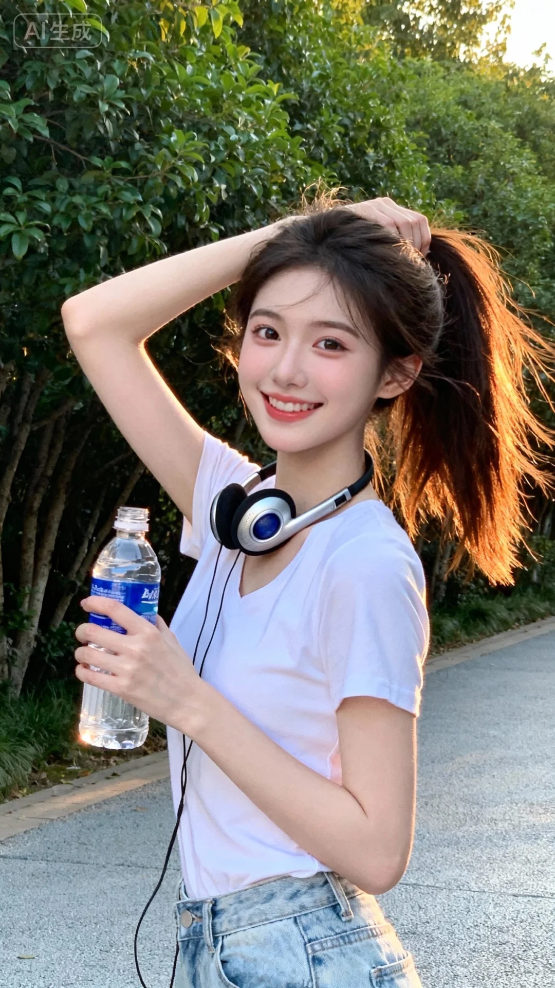 风格甜美少女系,氛围慵懒俏皮,东方美女,年轻娇小,冷白皮气质美女,纯欲风,皮肤白皙,偶像气质,fairskin,气质的江南美女子,有点甜美,皮肤美白透亮,表情可爱,甜美氛围,细腻笔触,独特韵味的美,可爱表情,笑容甜美灿烂,眼神明亮看向镜头,整体气质清新又活泼。内搭是简约的白色T恤,外穿浅水洗蓝的牛仔裤;脖子上挂着一副银灰与黑色相间的复古头戴式耳机,耳机线自然垂落;右手握着一瓶透明塑料瓶装矿泉水,瓶身带有蓝色标签。左手轻触头顶的马尾,右手自然握持矿泉水,头部微侧,整体姿态俏皮灵动,充满青春活力。拍摄于户外的林荫道,背景是茂密的绿色树木,枝叶层叠,地面能看到浅灰色的道路铺装纹理,整体环境是充满自然绿意的公园或街边绿植区,氛围清新自然。采用黄金时刻的自然光拍摄,光线为侧逆光方向,从人物侧后方洒入,在发丝、手臂边缘形成柔和的暖调轮廓光,勾勒出人物身形;面部受光均匀,阴影过渡自然,背景的绿色植被在暖光下呈现出清新的色调层次,画面整体光影柔和,营造出治愈的夏日和傍晚氛围感