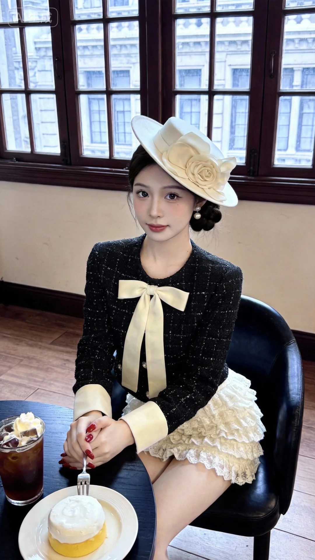 风格甜美少女系,氛围慵懒俏皮,东方美女,年轻娇小,冷白皮气质美女,薇薇纯欲风,皮肤白皙,偶像气质,fairskin,气质的江南美女子,有点甜美,皮肤美白透亮,表情可爱,甜美氛围,细腻笔触,独特韵味的美,耳朵佩戴珍珠耳饰,指甲涂有红色指甲油,整体气质兼具优雅与甜美元素。佩戴一顶米白色夸张设计的礼帽,帽檐处装饰有同色系花朵,风格复古。穿着黑色细闪小香风外套,圆领设计,搭配米白色飘带蝴蝶结内搭,外套袖口也为米白色拼接,黑白撞色凸显精致感。搭配米白色的蕾丝/褶皱质感半身裙,与上装的米白色元素呼应,整体穿搭复古优雅。坐在椅子上,身体正对镜头,双手交叠放在桌面,右手握着一把银色叉子,手指自然搭在餐具上,姿态端庄,眼神直视镜头,场景为复古风格的室内甜品店:背景是深棕色边框的多格窗户,窗外可见复古建筑外立面;墙面为浅米色,地面是木质地板。桌面是深色材质,摆放着白色餐盘(盘中有一份顶部为白色奶油/慕斯、底部黄色的甜点),旁边还有一杯加了冰块和奶油的冰咖啡;座椅为黑色皮质款式,整体环境温馨且充满复古情调