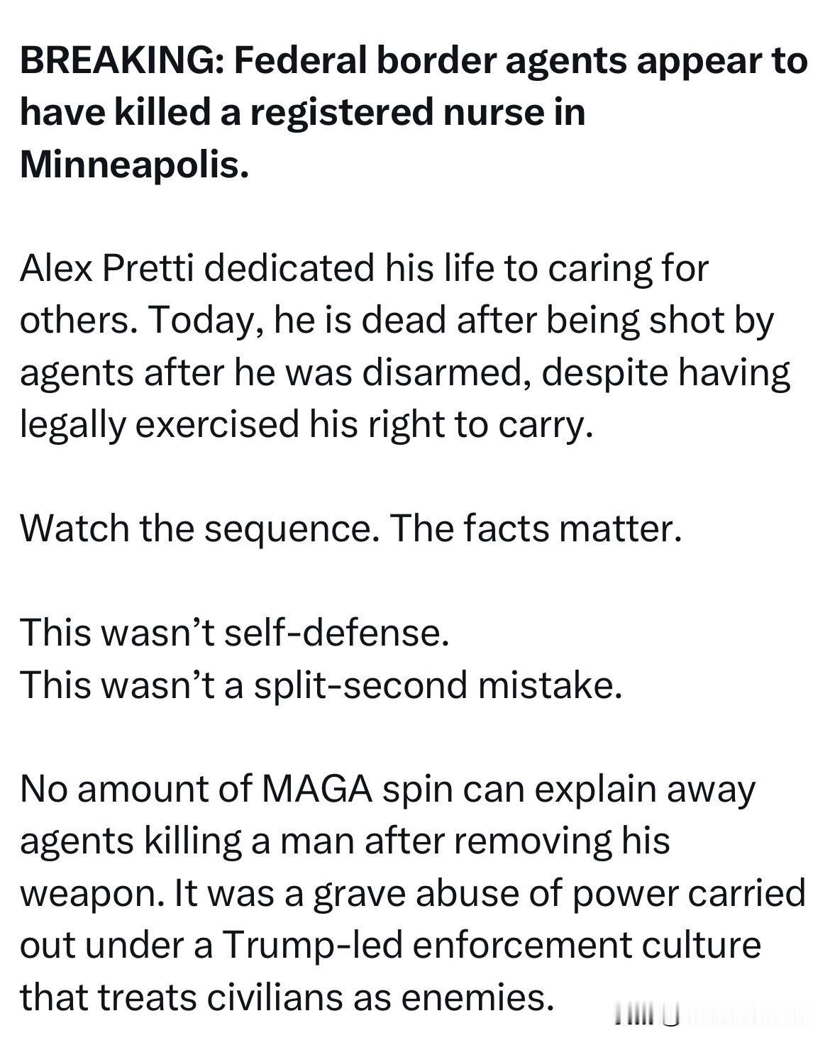 周六突发新闻:美国联邦边境执法人员据悉在明尼苏达州明尼阿波利斯市枪杀了一名注册护士。 背景资料:被害人亚历克斯·普雷蒂一生致力于照顾他人的注册护士。媒体报道:今天他被执法人员在其已经缴械后仍被枪杀;与此同时,被害人声称曾合法行使持枪权。 当地网络媒体评论: “这不是自卫。这并非一时冲动的错误。 任何MAGA(让美国再次伟大)的宣传都无法掩盖执法人员在缴获男子武器后将其击毙的事实。 这是在现任总统特朗普领导下,将平民视为敌人的执法文化下,严重滥用职权的行为。”