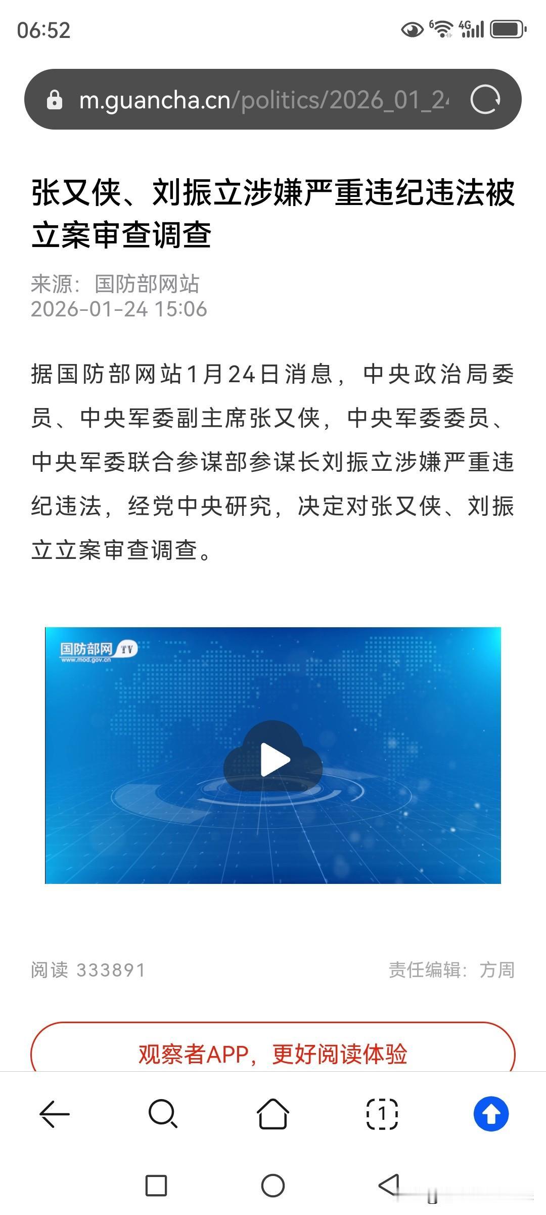 昨先从外网偶见军界张刘被查,一时不信认为乃“造谣”,便又查国内网站。 几分钟后再从观察者网看到,却仍在疑惑,咋可能呢?前2天还见张出镜新闻。 又过了会,凤凰网和今日头条才纷纷报道张刘被查消息,此时才确信无疑。 顿时就感叹,如今可真是“王子犯法与庶民同罪”时代嘞!无法外之地也无任何人不受法律约束;而且张还是“将门之子”“根正苗红”呢! 从此还更看到,当下风腐同查不仅促进社风政风民风根本好转,而且使国家大有希望、人民也更有信心。