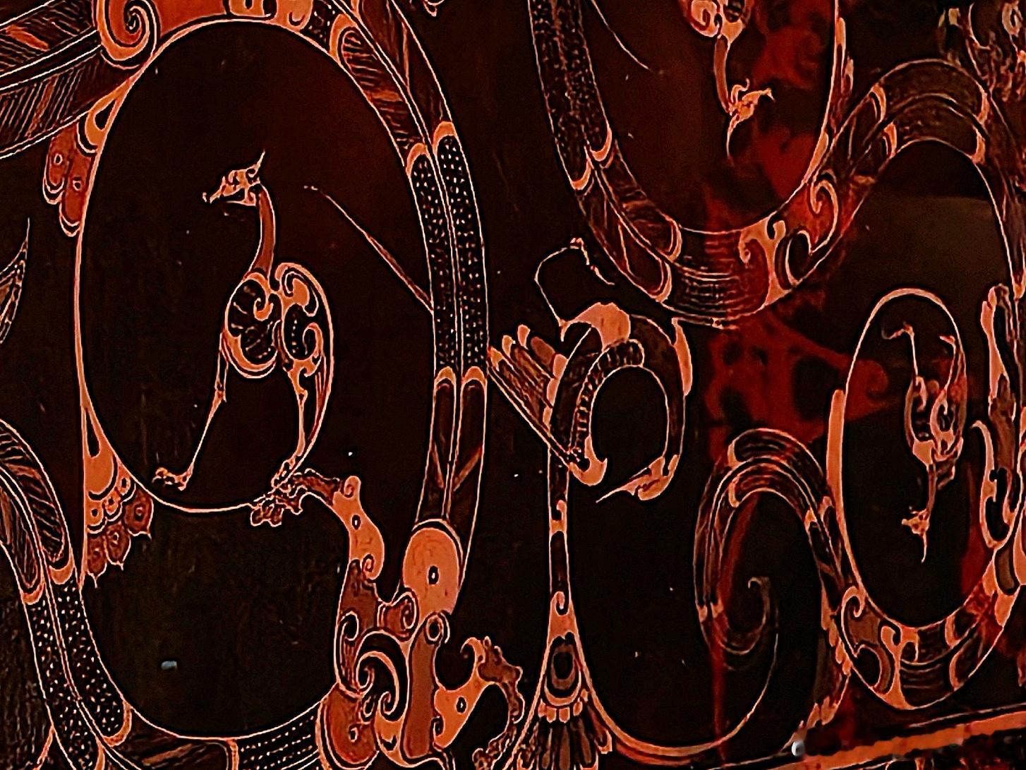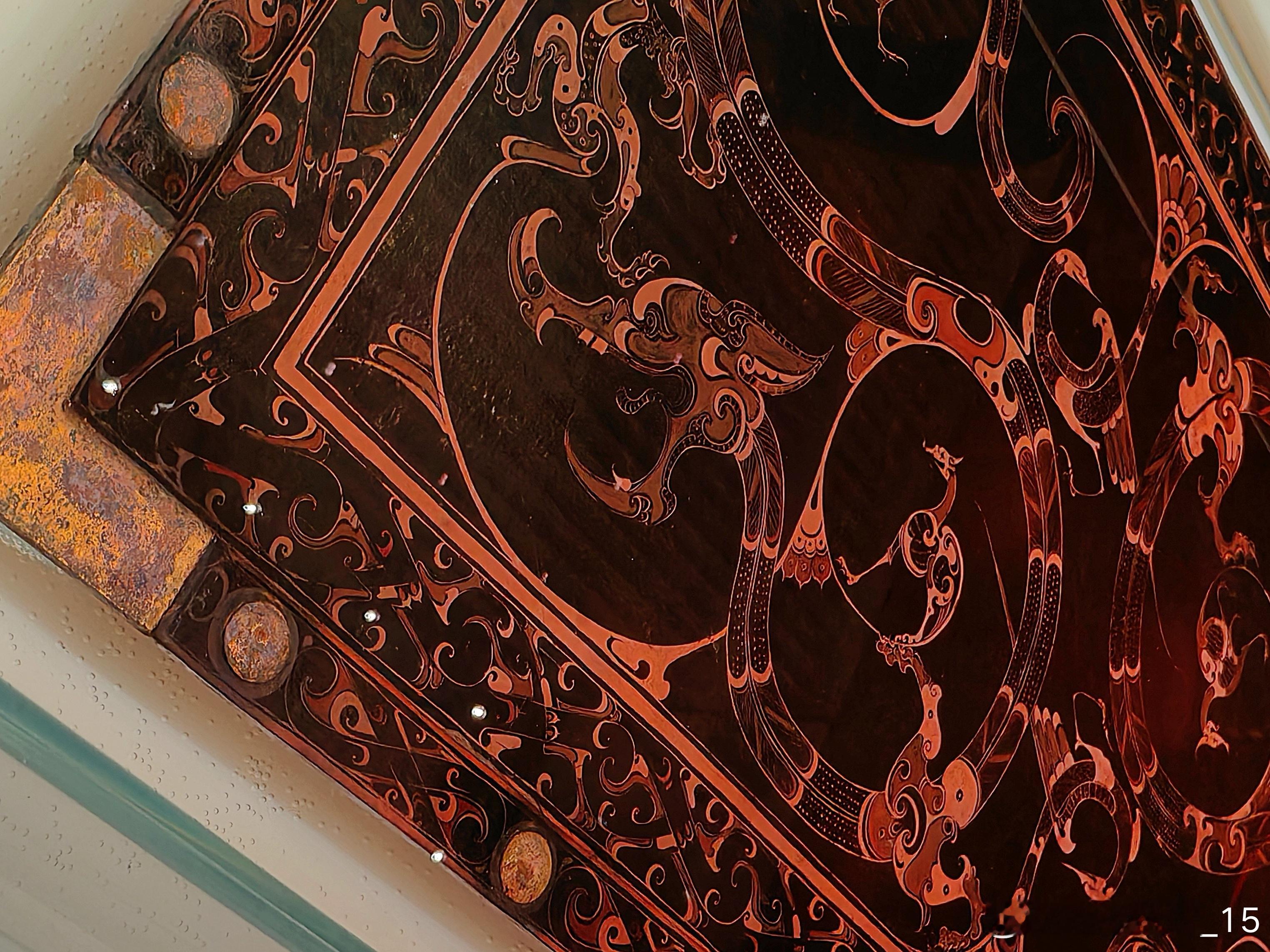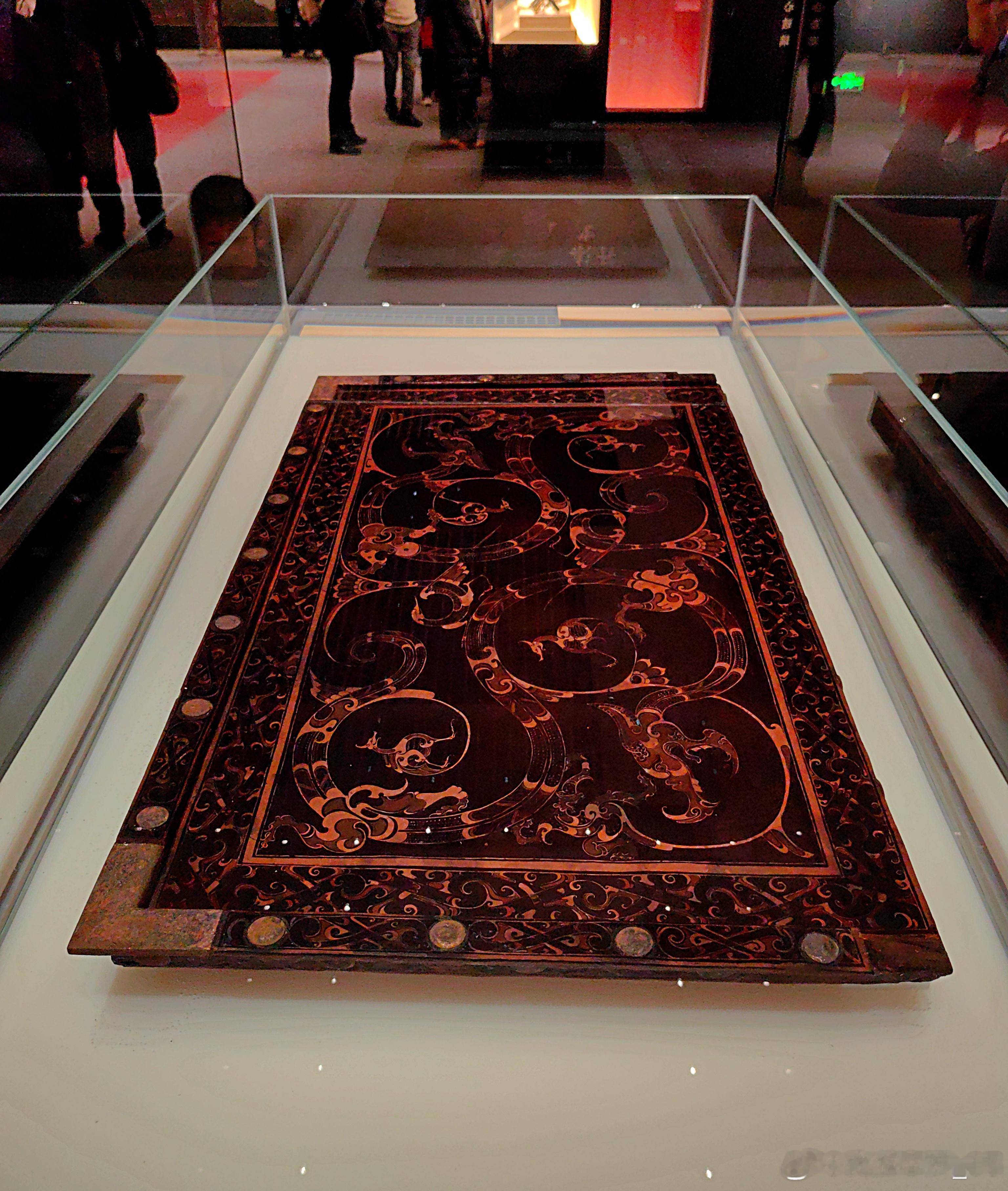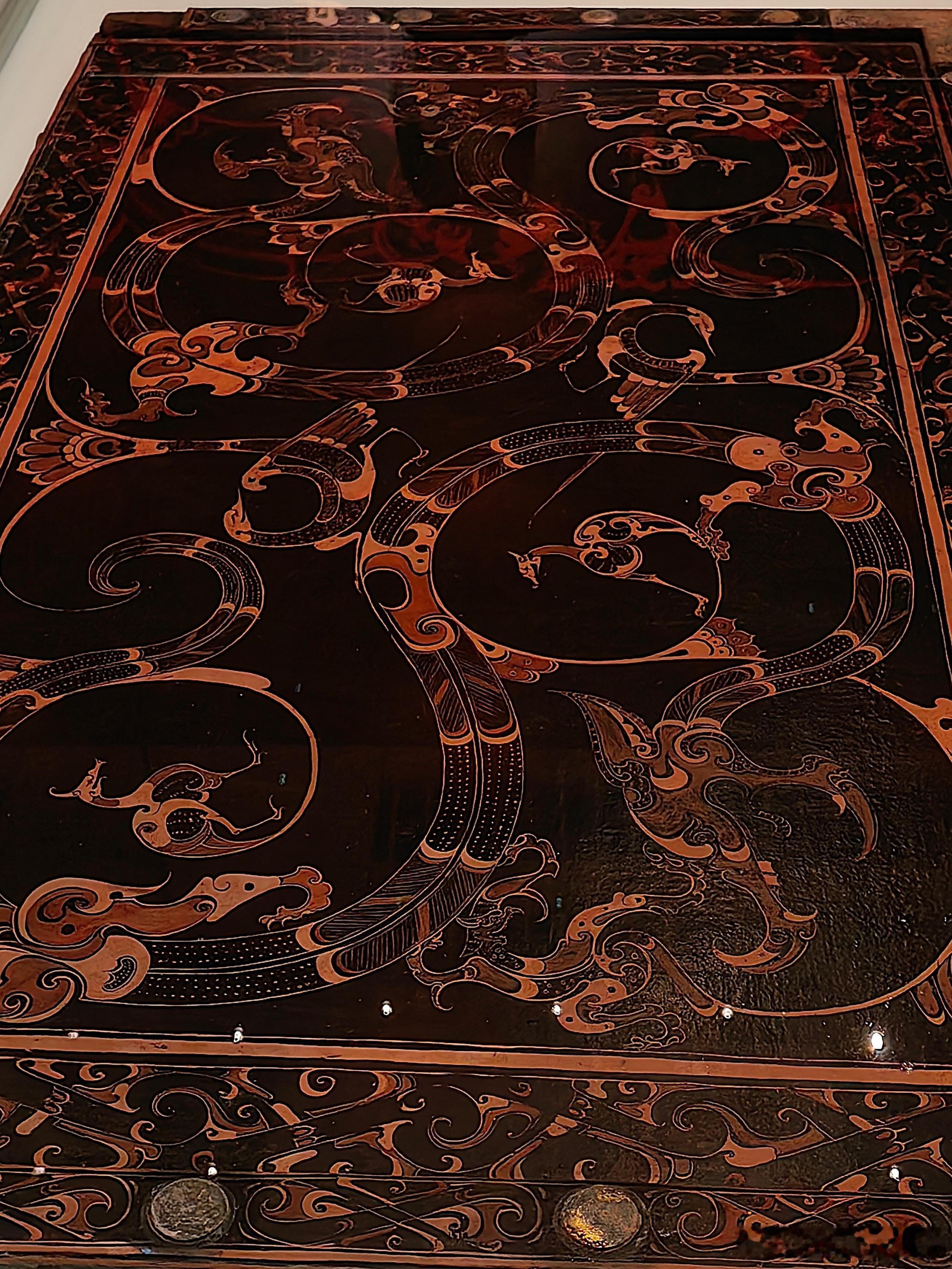 我的2026 【遇见考烈王-安徽淮南武王墩一号墓考古成果展】彩绘龙凤纹漆木案·战国安徽淮南武王墩一号墓出土。先秦时期,贵族宴饮时席地而对坐,案会摆在身前,用来盛放鼎、簋、爵等食具酒具。先秦时的案普遍矮小,与当时席地而坐的起居方式相适配。2026.1.21国家博物馆约会博物馆文物