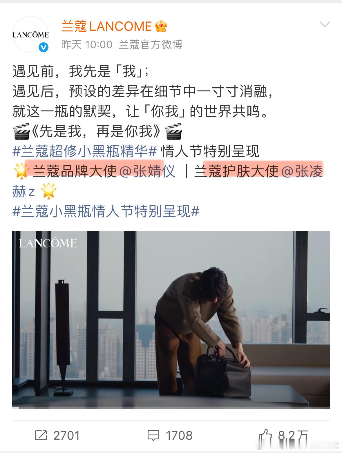张凌赫 兰蔻 兰蔻的情人节企划前两天还让网友嗑生嗑死 大喊赶紧给张凌赫张婧仪递本子兰蔻甚至连发好几天小短片,但是兰蔻忽略了两位演员代言tittle上的区别,呈现出了张婧仪品牌大使,张凌赫护肤大使毕竟张凌赫商业和影视价值现在还比较受主流认可 看对接说兰蔻情人节物料还在沟通调整,是要给张凌赫升tittle吗?