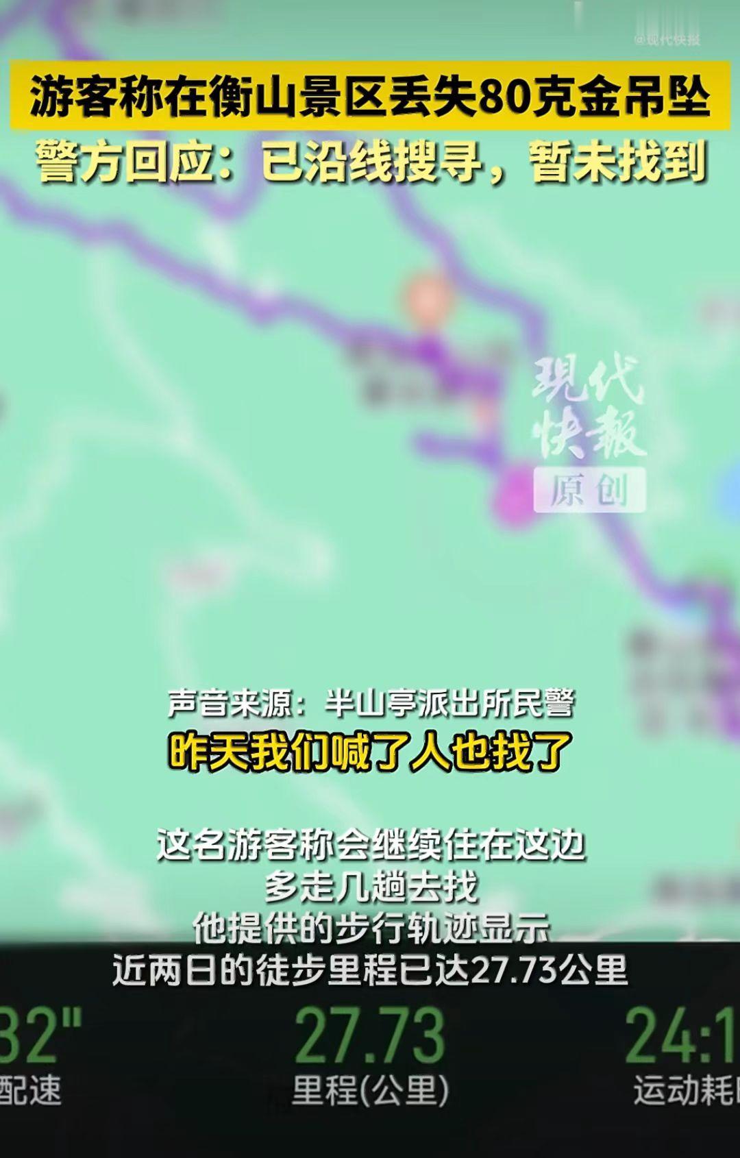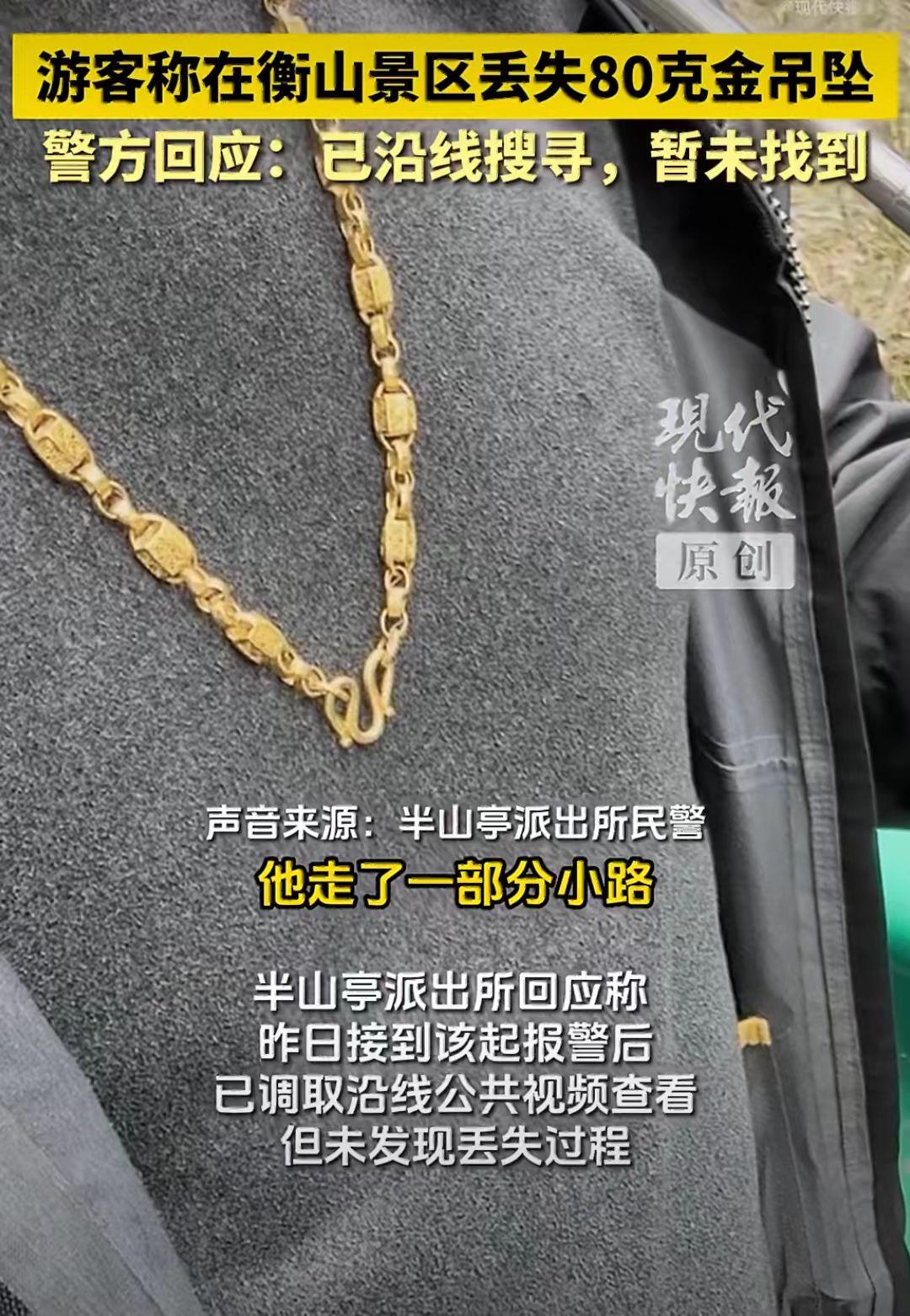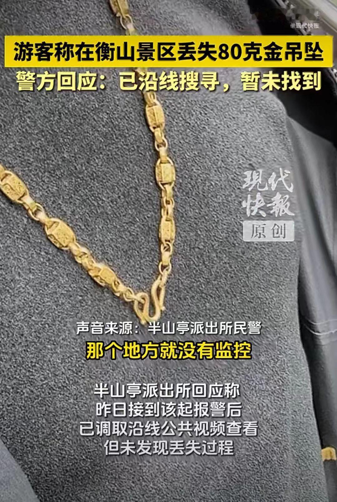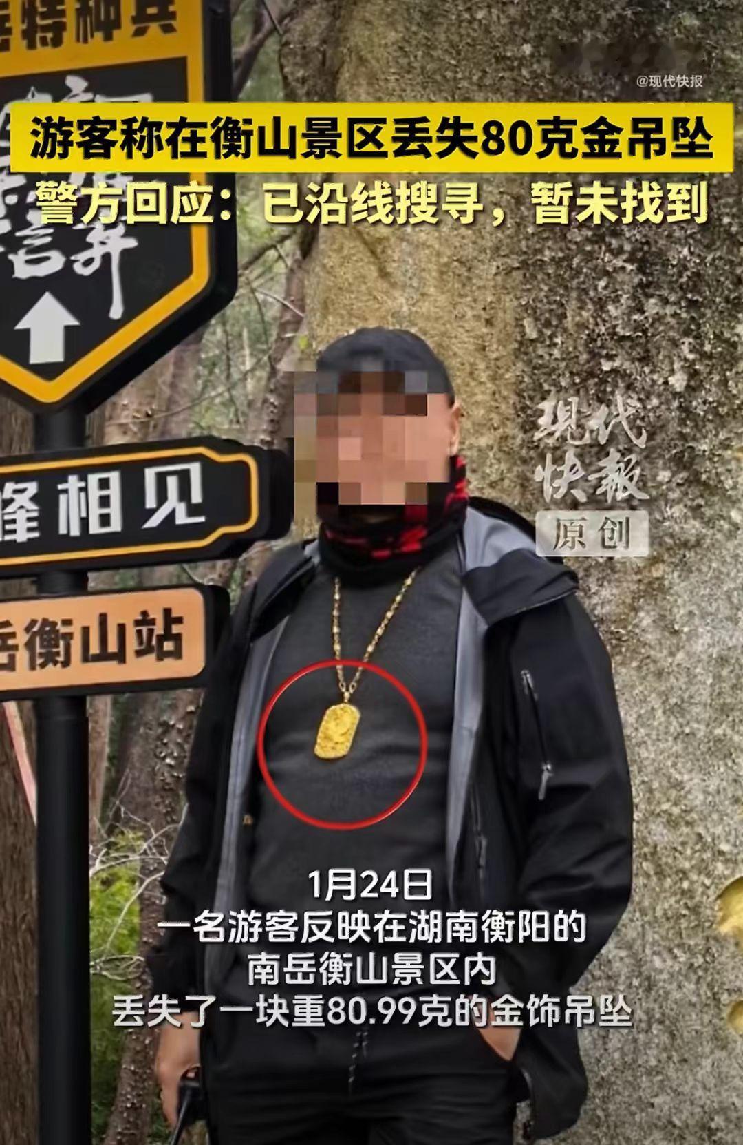 亏大了,广西张先生和朋友约好一起爬衡山, 在爬山的过程中,张先生脖子上戴的80克的金牌竟然丢了。 80克的金子,价值12万多啊! 张先生急了,急忙报警求助,拍视频说明情况,景区工作人员知道后,连忙帮助找寻。 结果可想而知,爬山徒步旅行,两日后才发现金牌丢失了,一共行走了27.73公里,估计是很难找到了。 警方接到报警后,立即调取视频排查,但是张先生走了很多山间小路,没有监控,无法确定在哪遗失,找回难度加大,简直可以说是大海捞针了。 不明白出去游玩为什么要带贵重物品,老话说的好,财不外露,就是不丢也容易遭贼惦记啊! 你觉得张先生还能找的到?
