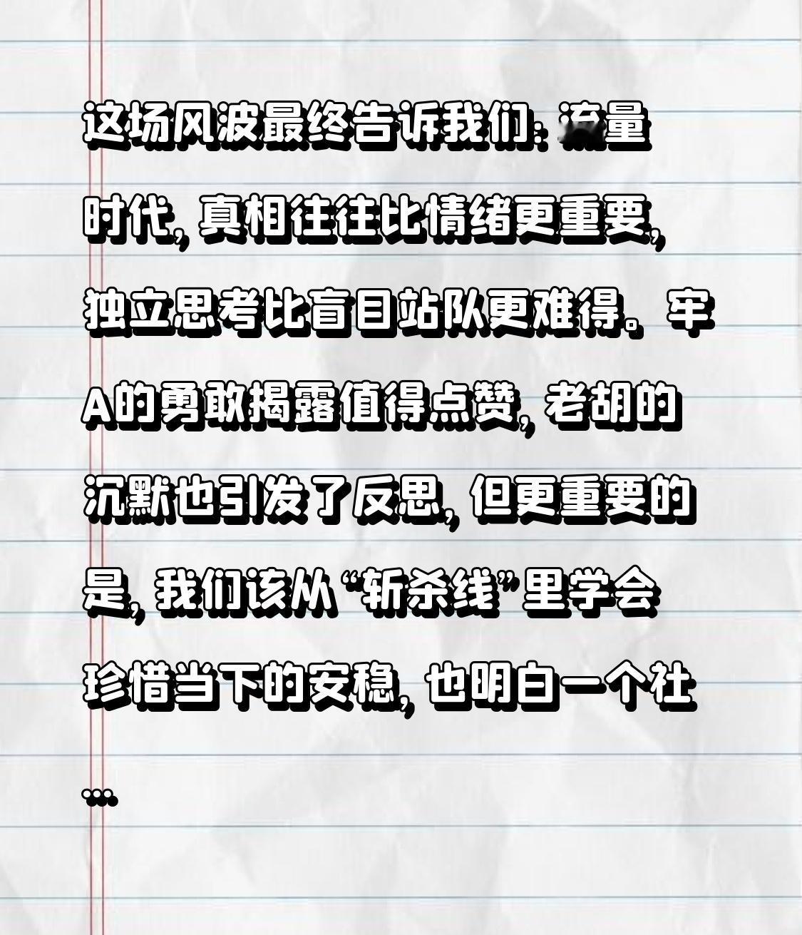 炸锅!胡锡进终回应牢A斩杀线,沉默15天后的表态,戳穿流量时代的真相 家人们,全网吵疯了的“斩杀线”事件,终于等来了胡锡进的回应!这个让中文互联网沸腾一个月的话题,一边是00后留学生牢A揭露美国社会残酷真相,一边是“逢热必评”的老胡反常沉默,15天里网友猜疯了:“他为啥不说话?”“是不是有难言之隐?” 直到最新发声,老胡的一句话,直接戳穿了当下舆论场的底层逻辑! 先回顾下这场风暴的起点:留美法医助理牢A,用游戏术语“斩杀线”揭露美国社会真相——中产家庭只要遭遇失业、重病,就会跌破生存临界点,被系统“一键清除”,沦为流浪汉后平均寿命不足50岁。他的亲身经历+硬核数据,比如“67%美国人月光,400美元意外开支都拿不出”,瞬间撕碎了“美国梦”的遮羞布,相关视频播放量超5亿,连西方媒体都急着围剿,骂这是“认知战”。 可就在全网热议时,第一个钩子来了:以评论热点著称的胡锡进,却突然“失声”了!要知道,之前董明珠拒用海归、预制菜争议,他都第一时间发声,可这次面对“斩杀线”这个超级流量话题,他只在1月11日提了句概念,之后半个月一言不发。网友们瞬间炸了,各种猜测满天飞:有人说他女儿有留美经历,怕立场冲突;有人说他不敢触碰尖锐议题,怕丢了“平衡派”人设;还有人调侃“老胡不是不想蹭,是不敢蹭”。 第一个转折点,是老胡的被迫回应。随着质疑声越来越大,他终于发文澄清:“沉默是我的权利,公众人物没必要对每个热点都表态”,还否认了“家人留美陪读”的谣言,强调自己只是不想被流量裹挟。可这番回应非但没平息争议,反而让网友吵得更凶了:支持他的人说“沉默权该被尊重”,批评者则反驳“关键议题回避就是失职”,甚至有人模仿“胡编体”写AI评论,调侃他的“圆滑”。 更有意思的第二个反转:老胡的沉默,反而让“斩杀线”话题更火了!大家发现,这场争议早已不只是“美国社会真相”,而是变成了对舆论场的拷问:为什么一个民间观察能引发这么大波澜?为什么公众人物的沉默会被过度解读?其实答案很简单:牢A的话戳中了普通人对“安全感”的渴望——一个健康的社会,不该让努力生活的人轻易坠入深渊;而老胡的沉默,恰恰暴露了流量时代的困境:话题越热,越难有人冷静说话,要么站队蹭流量,要么沉默避祸。 第三个关键转折,藏在事件的后续发展里。牢A因为被西方媒体污蔑、个人信息曝光,在使馆协助下紧急回国,而他的经历反而印证了自己的“斩杀线”理论——在美国,触及制度痛点的言论根本没有自由。与此同时,越来越多在美华人、留学生分享真实经历:有人说“不敢生病,救护车5000美元起步”,有人说“失业即破产,房贷断供就被驱逐”,这些声音让“斩杀线”从一个概念,变成了无数人的真实困境。 老胡的回应里,有句话其实说到了点子上:“复杂的社会议题,不该被简化成情绪宣泄”。确实,“斩杀线”的意义,从来不是为了贬低美国,而是让我们看清:没有完美的社会,真正的强大,是给普通人足够的抗风险缓冲垫——就像中国的医保、社保,还有遇到危险时能提供庇护的祖国,这些才是我们最坚实的底气。 这场风波最终告诉我们:流量时代,真相往往比情绪更重要,独立思考比盲目站队更难得。牢A的勇敢揭露值得点赞,老胡的沉默也引发了反思,但更重要的是,我们该从“斩杀线”里学会珍惜当下的安稳,也明白一个社会的进步,就是要让“斩杀线”越来越高,让每个人都不用怕“一步踏空就万劫不复”。 你怎么看待胡锡进的回应?你觉得“斩杀线”理论戳中了美国社会的痛点吗?评论区聊聊你的看法,点赞转发,让更多人看清流量背后的真相,也为每个努力生活的人,守住一份安全感!