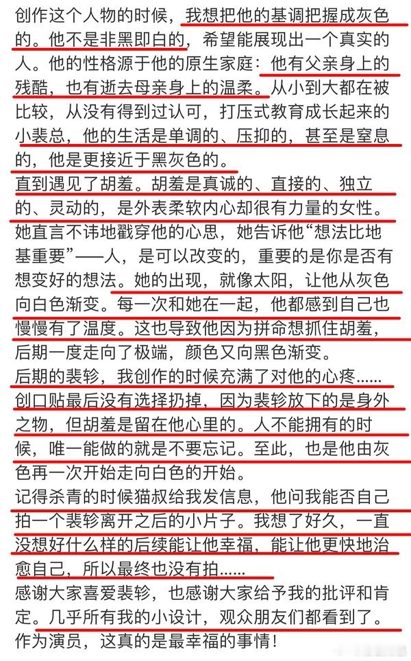 代旭千字长文告别裴轸这个收官大作文,每一段心路历程在剧里都能找到片段能有这种分享的很少了。现偶最大的魅力是什么,是一直很爱很爱女,才是最苏男的最高境界,他真的懂裴轸啊啊啊!!“几乎所有我的小设计,观众朋友们都看到了”天知道演员有机会说出这句话有多爽,哭辽。。真把人物吃的透透的。。要当老叔的角色粉了,希望叔以后能接更多好角色好本子