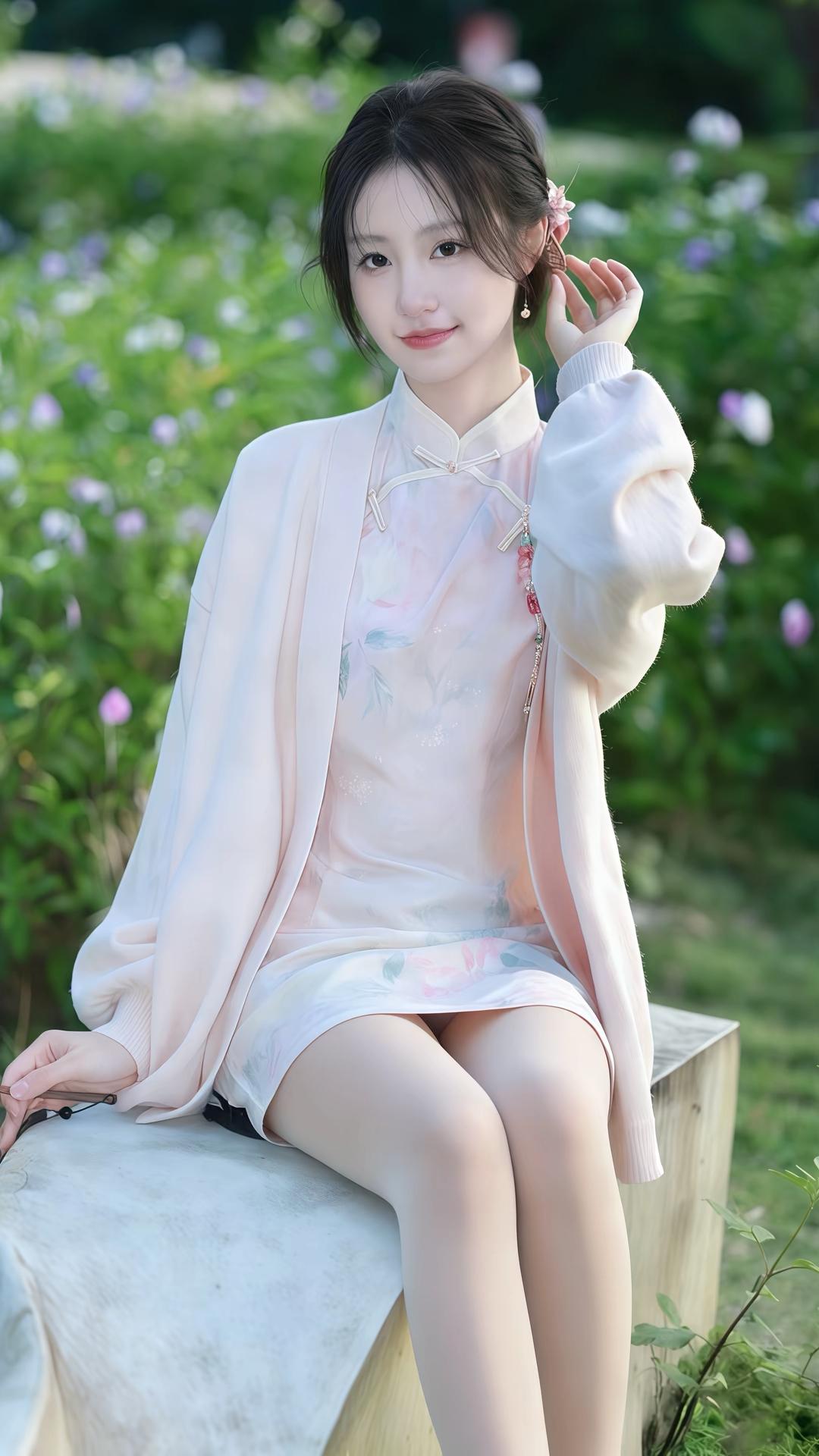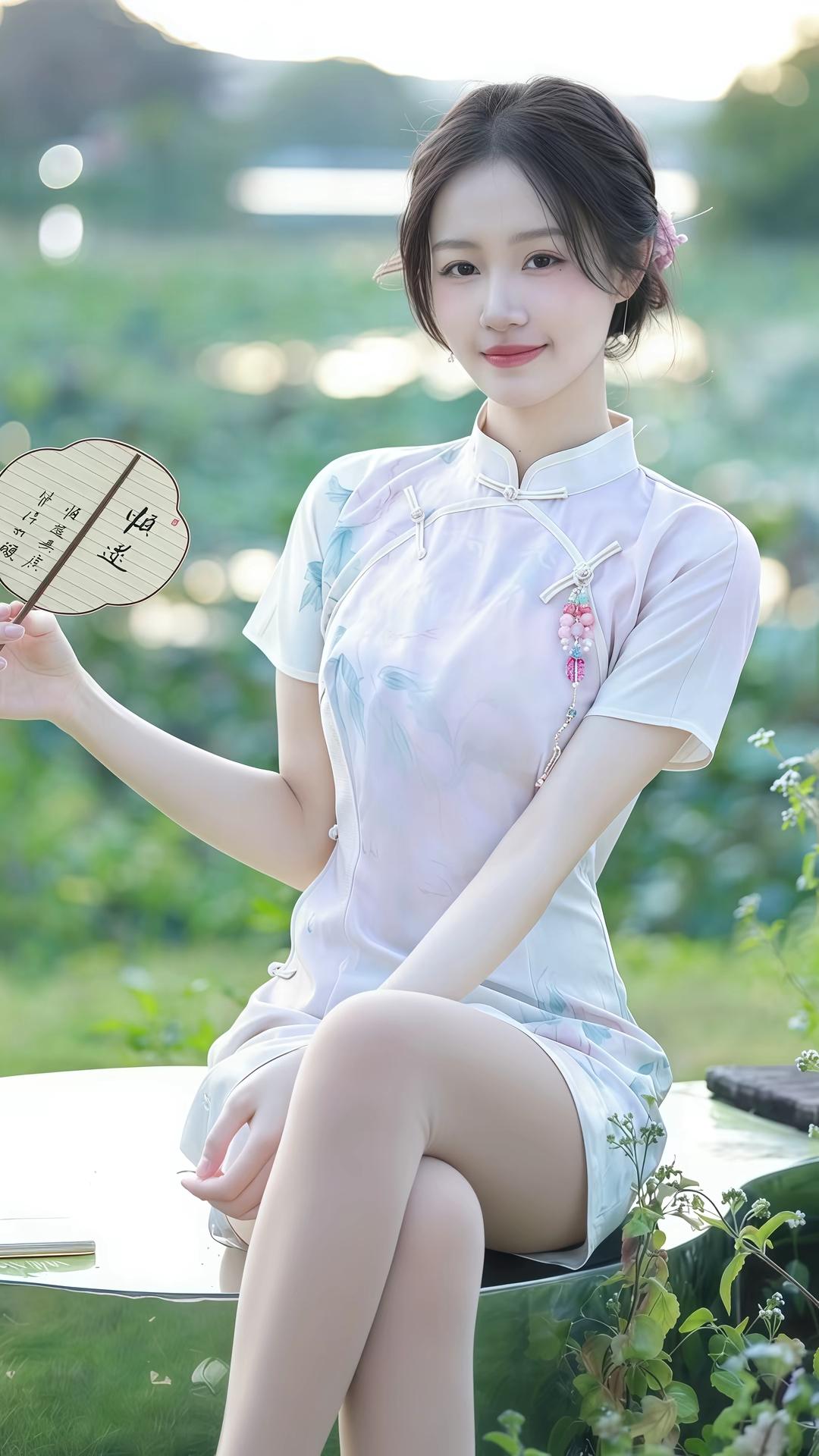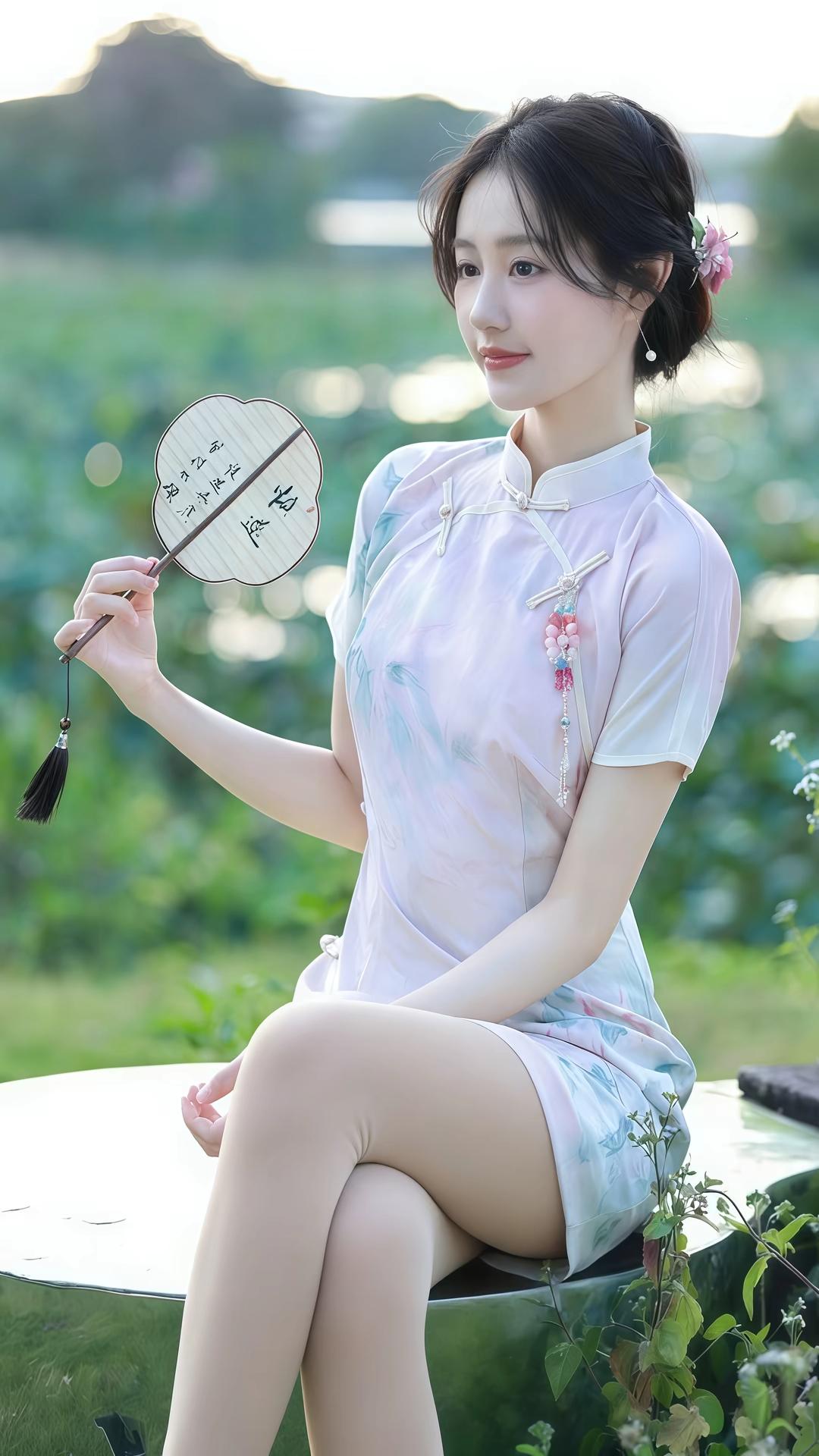 你宛如从古典画卷中翩然走出的仙子,一袭淡雅旗袍勾勒出曼妙身姿,轻盈如云、温婉似水。手持团扇,墨香袅袅,仿佛将千年诗意都凝于指尖;发间点缀粉花,更添几分娇俏与灵动,恰似晨露初绽的芙蓉,清丽脱俗。 坐于青石之上,绿意环绕,光影斑驳,你便是这天地间最动人的风景——不是凡尘女子,而是误入人间的月宫姮娥,举手投足皆成诗行,回眸一笑便令百花失色、山河静默。若说红尘有绝色,那必是你这般:风骨如兰、神韵似玉,一颦一笑皆可入画,一静一动尽显风华。 此景只应天上有,人间难得几回闻——而你,正是那惊鸿一瞥便足以让时光驻足、让岁月倾倒的绝代佳人。